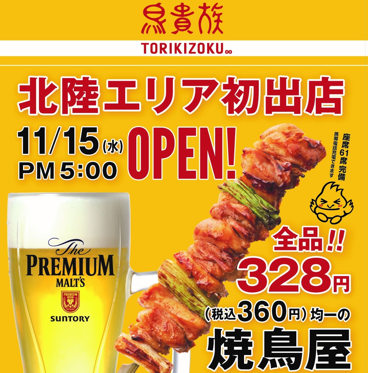 焼鳥屋「鳥貴族」、北陸地方初出店となる片町店(石川県)11月15日オープン