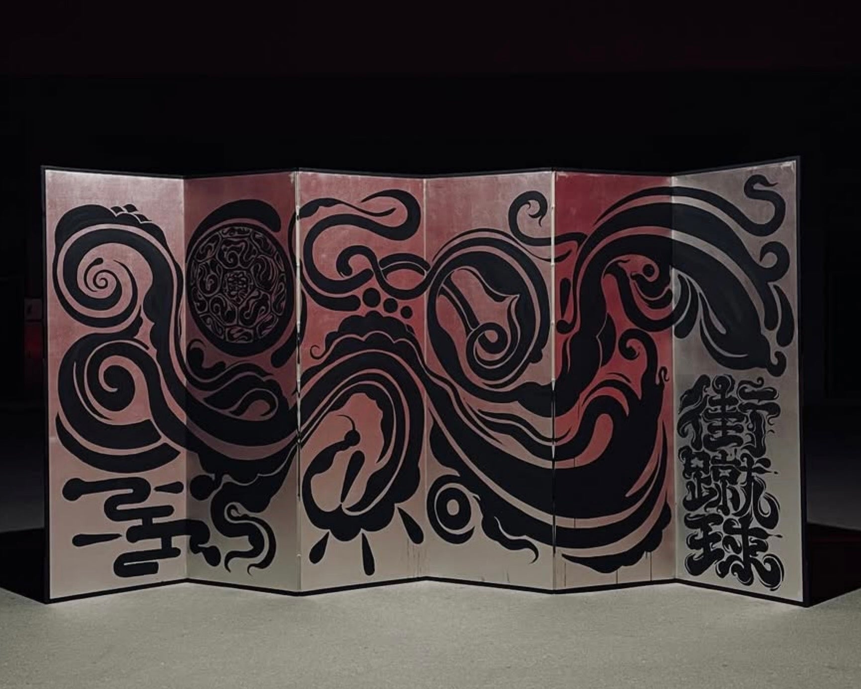 会場は14歳注目のDJ K3ZMなどの演奏がなされている中、ストリートサッカーの試合とともに幅4.2m 高さ2mの"特大銀屏風"に黒線と称された独自の流線模様で描くSOLIDがライブペイント。日が暮れるとともにスタンド下の無機質な空間は、赤いライトに染まった大きな柱、演奏、屏風とストリートサッカーが一体となるいい空間に。
