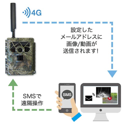 昨今では、様々な捕獲検知ツールが販売されていますが、4G通信を利用して画像・動画をメールで送信できるトレイルカメラも同様の役割を担うことが可能です。リアルタイムで捕獲を検知できることから見回りの効率化、捕獲後の放置時間減少が可能となり、ジビエ利用の促進にも繋がります。