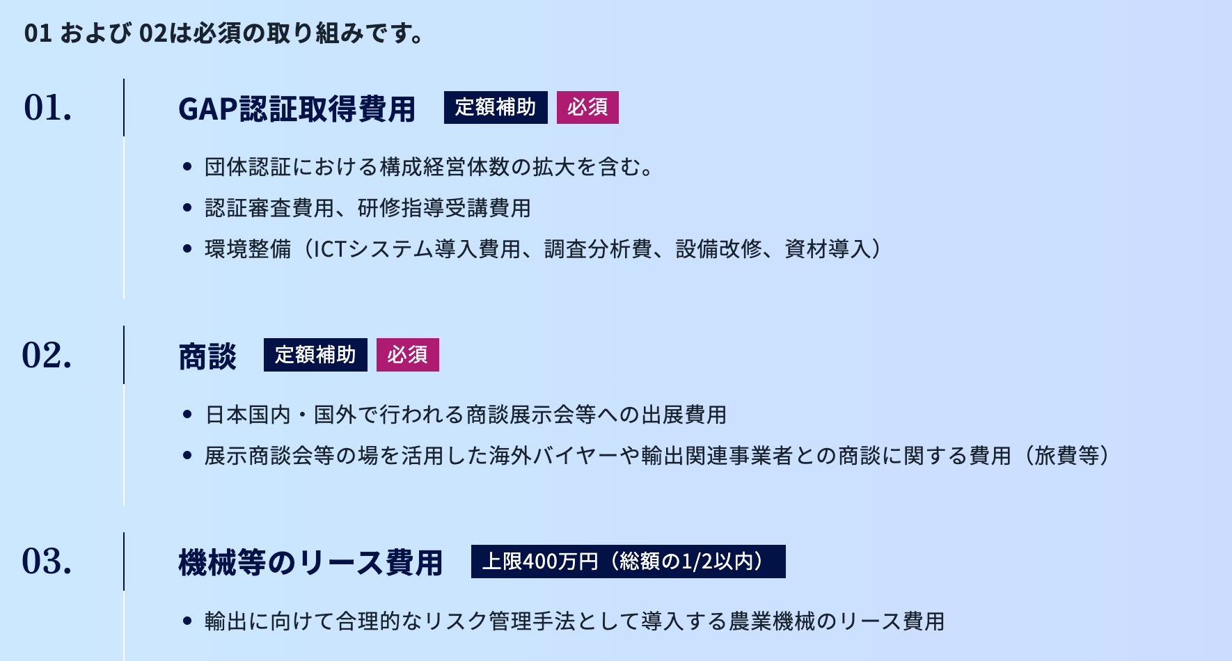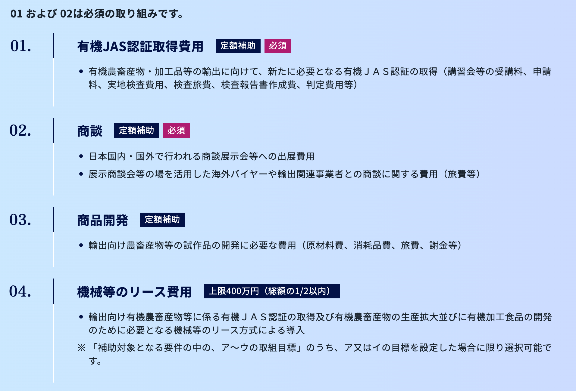 農畜産物・有機加工食品を扱う事業者へ有機JAS認証・GAP認証の取得や海外展開における費用負担だけでなく、採択された事業者への個別相談会やセミナーを通して事業をサポートする取り組みです。