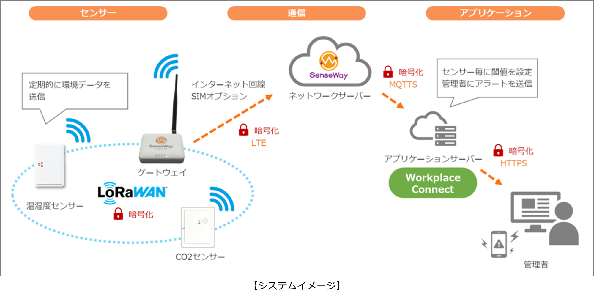 ワークプレイスコネクトは、物流施設やオフィスなどの屋内環境を一元管理できるIoTソリューションです。温度湿度センサーやCO2センサーなどにより環境データを集計、グラフ化し、現場の状況を一目で把握することができます。また、アラート通知機能により、温度や湿度、WBGT値などが異常値を計測した場合は、管理者にメール通知を送信します。これによって、熱中症の対策や従業員の安全管理を遠隔で素早く行えます。