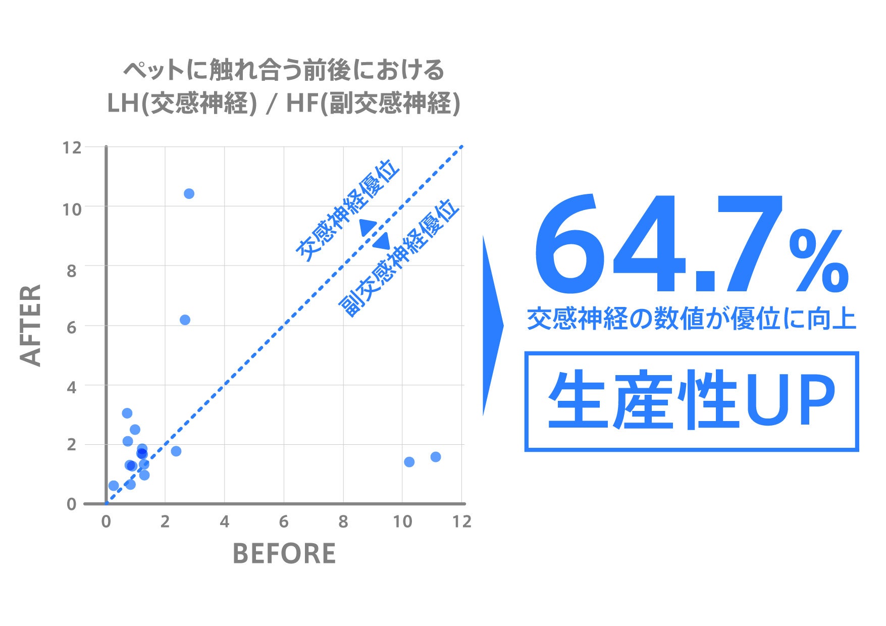 実験の結果、犬と触れ合うこと、また犬のいる環境で働くことで、脳が活性化し、64.7%の被験者が交感神経が優位に変化することがわかりました。特に昼食後のように副交感神経が大きく優位になるタイミングでペットに触れることで、午後の仕事の生産性を大きく高める可能性があります。