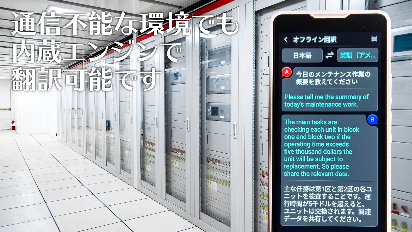 セキュリティルームやへき地など、通信環境に恵まれない環境でも、Mayumi4は内蔵翻訳エンジンのみで翻訳可能です。また翻訳言語は選択可能で、使用する言語のみを選んでカスタマイズすることも可能です。