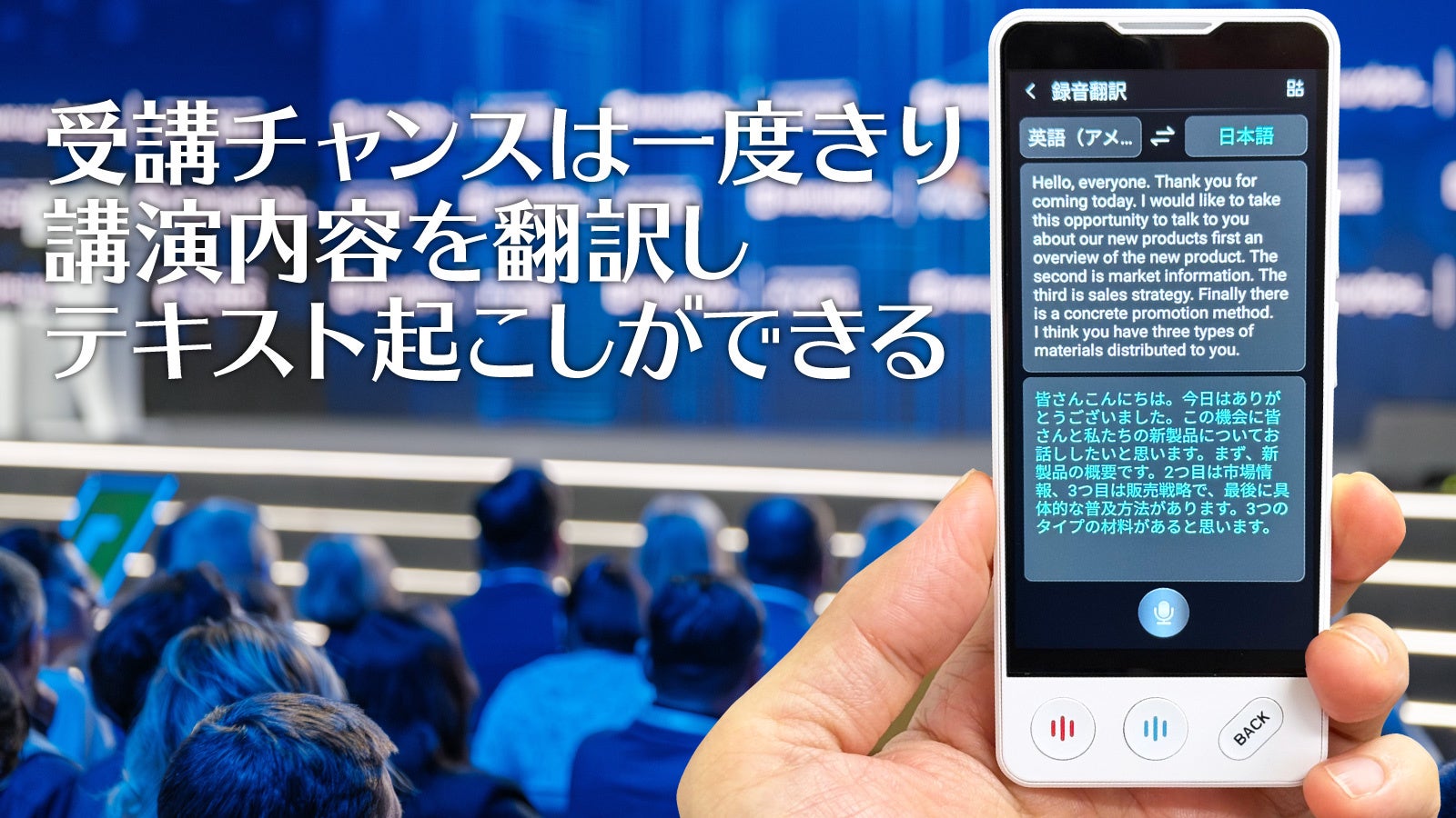 海外からゲストを招いた講演会や、世界同時配の基調講演演説など、チャンスは一度きりのとき、Mayumi4は頼りになるパートナーです。本体のボタンを押した状態でスピーチを録音翻訳し、録音データと翻訳した音声データ、テキストデータを生成。データはPC経由で出力できます。