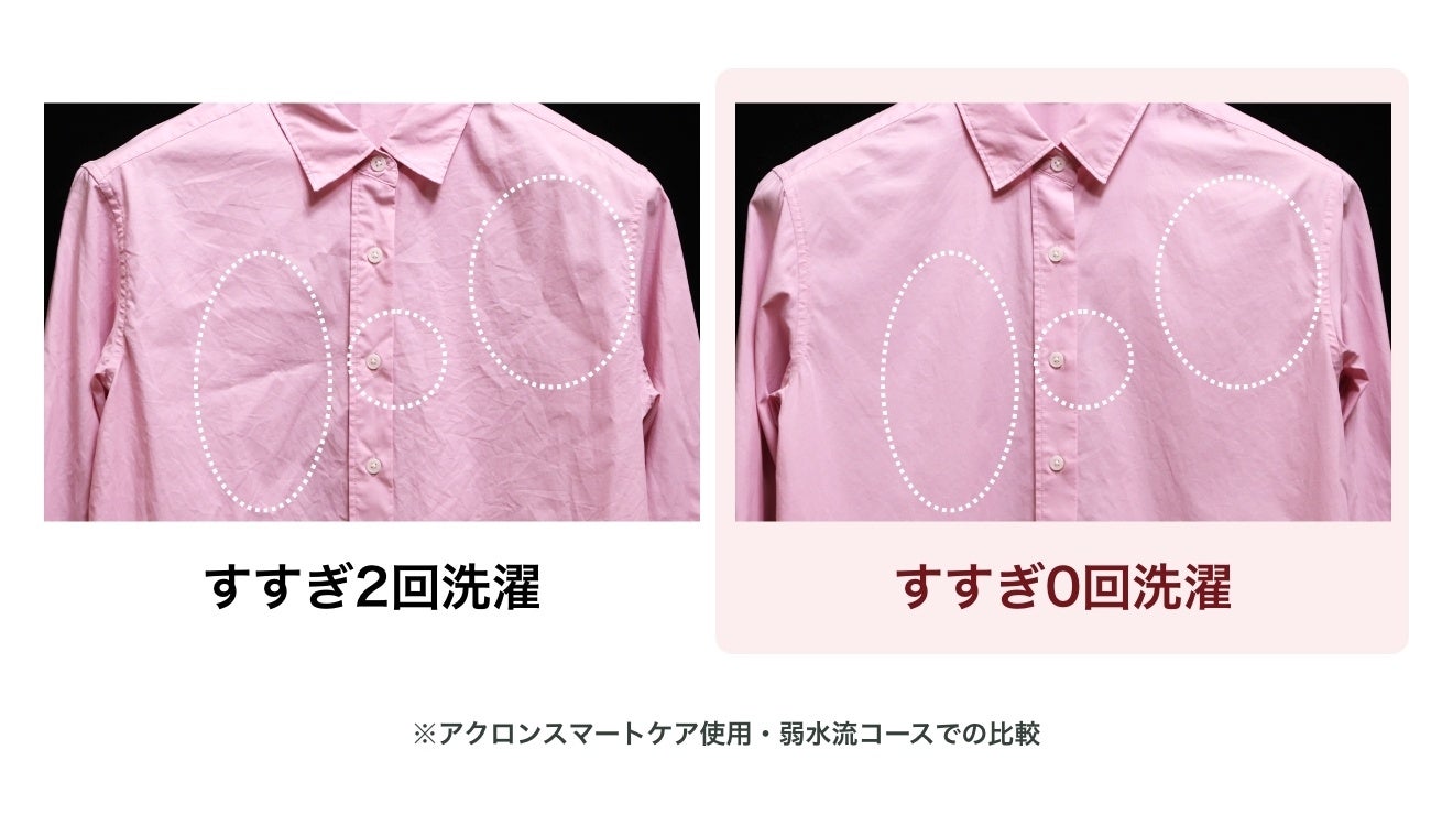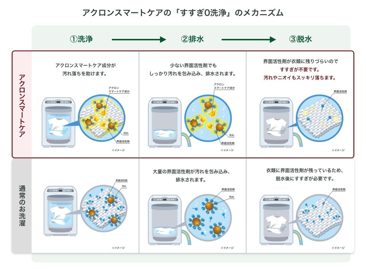 一般的に洗剤は、汚れを落とすために界面活性剤(洗浄成分)が必要で、脱水後も衣類に界面活性剤が残るため、すすぎが必要でした。しかし本製品は、新配合の再付着防止剤「アクロンスマートケア成分」が界面活性剤の働きをサポートするため、少ない界面活性剤でも汚れをスッキリ落とせて、更に汚れの衣類への再付着を防止します。脱水後の衣類への界面活性剤残りや汚れ残りがほとんどないため、洗濯工程の約7割を占めていたすすぎ工程をカットできます。