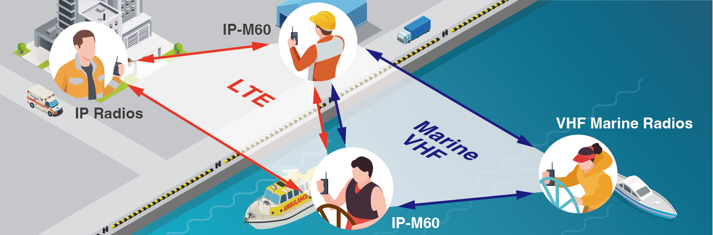 新製品「IP-M60」は、アナログ無線(国際VHF無線)による海上用通信と、携帯電話の高速通信規格(LTE)による陸上での連絡をともに利用できるトランシーバーです。