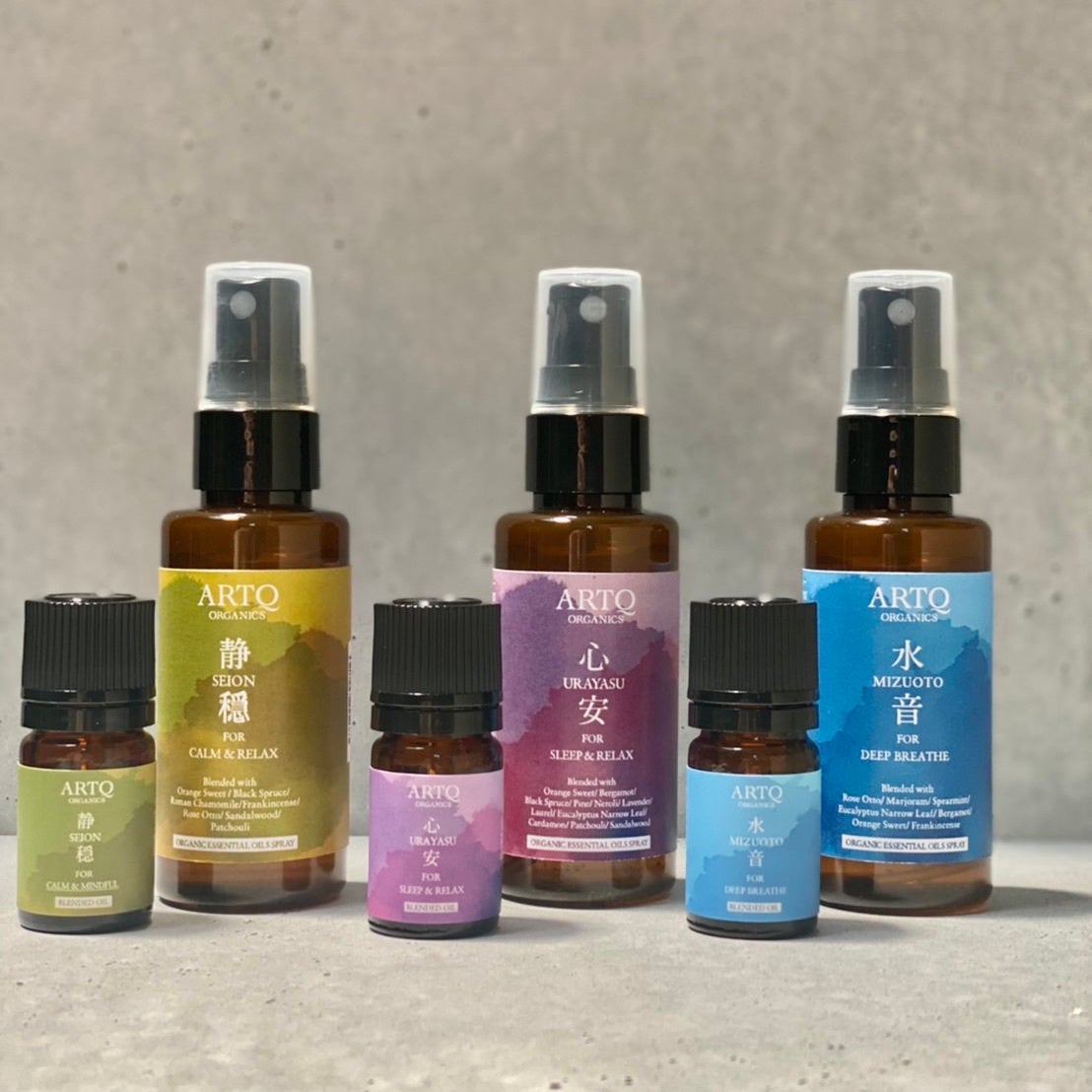 ARTQ ORGANICSと現在販売しておりますスプレーの処方を、さらに鮮度高い高品質の精油の香りそのものを感じていただけるように「ORGANIC ESSENTIAL OILS SPRAY 精油ブレンドスプレー」として順次リニューアルしてまいります。