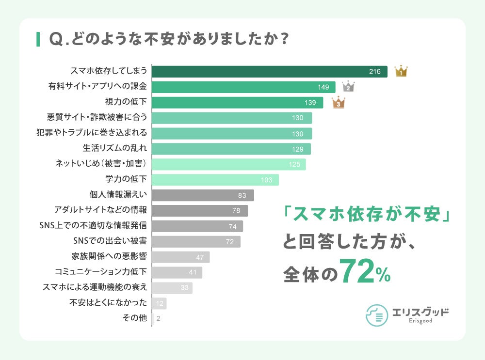もっとも回答が多かったのは「スマホ依存」への不安で全体の72%(300名中216名が回答)でした。