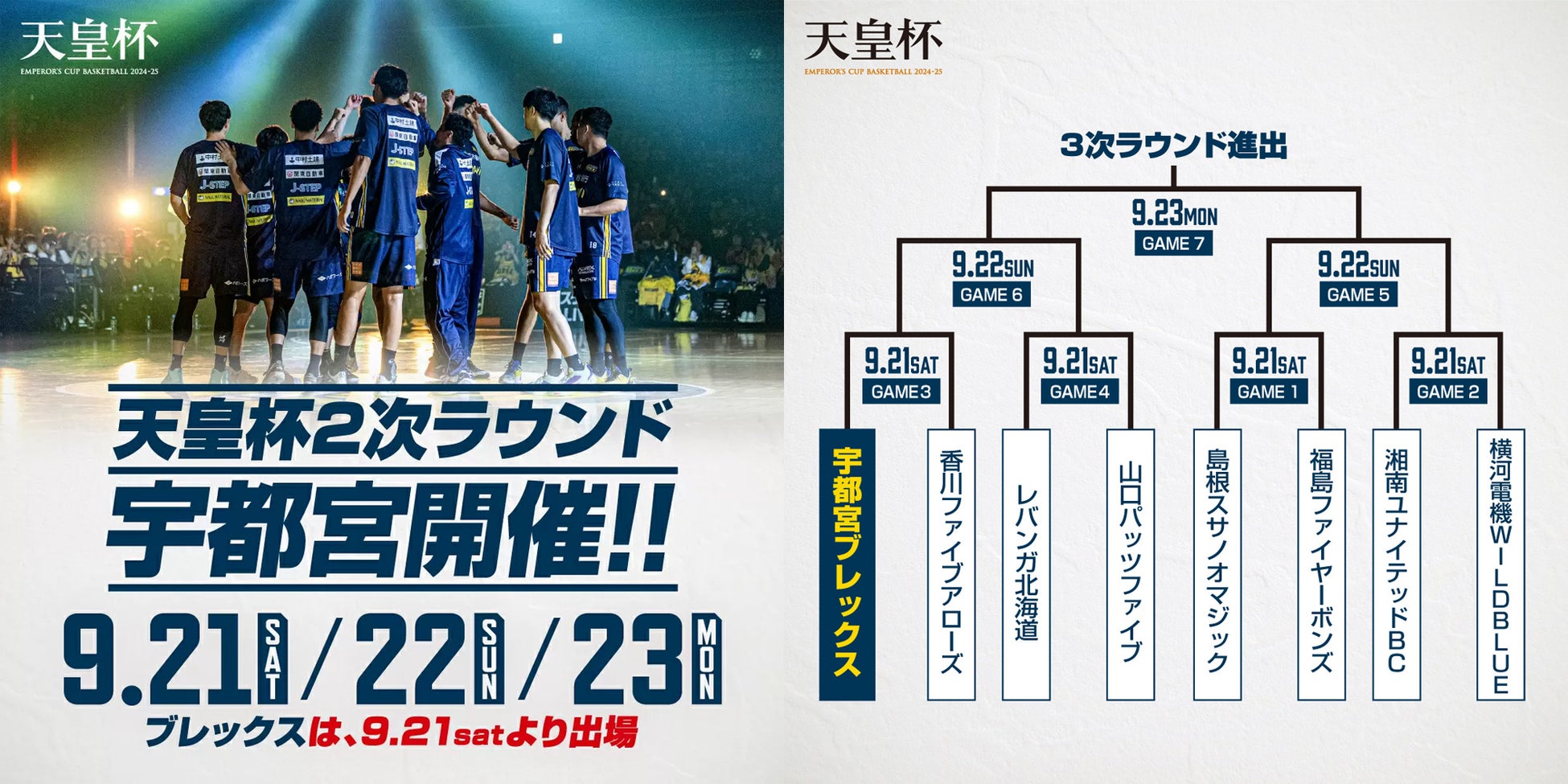 9月21日(土)から23日(月・祝)に第100回 天皇杯の2次ラウンドがブレックスアリーナ宇都宮にて行われます。ブレックスの初戦は、9月21日(土)の香川ファイブアローズ(B3)との対戦です。