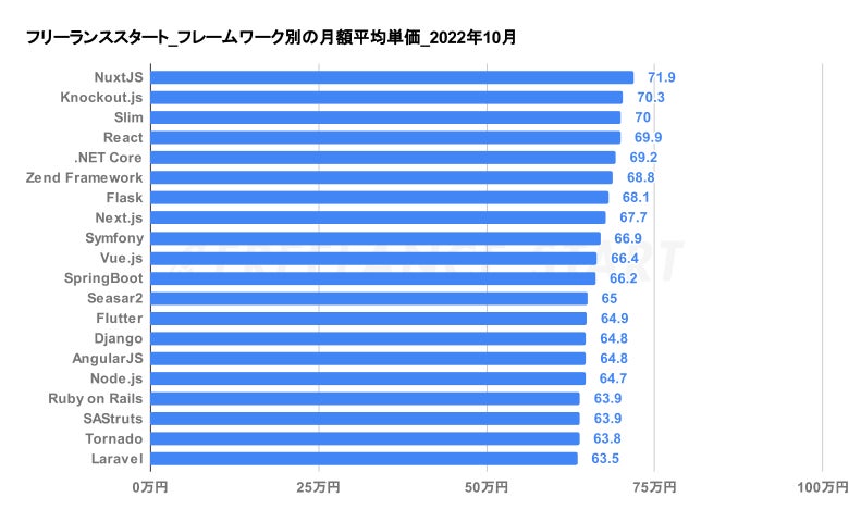 上記に記載しているフレームワークに関して、中でも「NuxtJS」や「Knockout.js」、「Slim」は増加トレンドにあり、具体的には1位「NuxtJS」が71.9万円(前月比+6.77万円・10.39%増)、2位「Knockout.js」が70.3万円(同+300円・0.04%増)、3位「Slim」が70万円(同+5,100円・0.73%増)でした。