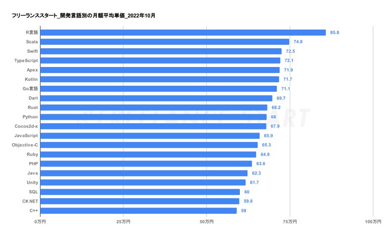 具体的な月額平均単価は1位「R言語」が85.8万円(前月比+6.32万円・7.9%増)、2位「Scala」が74.8万円(同-1.9万円・2.5%減)、3位「Swift」が72.5万円(同-6,500円・0.9%減)でした。