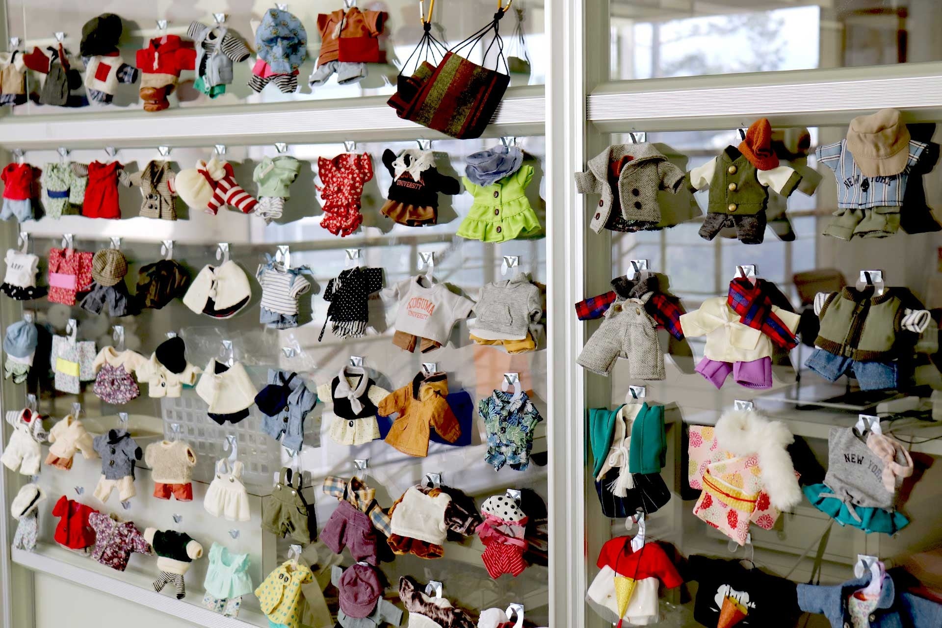 精巧に作られた手のひらサイズの小さな服たちは、長年培った技術だからなせる技。提携工場でひとつひとつ丁寧に手作業で作られています。