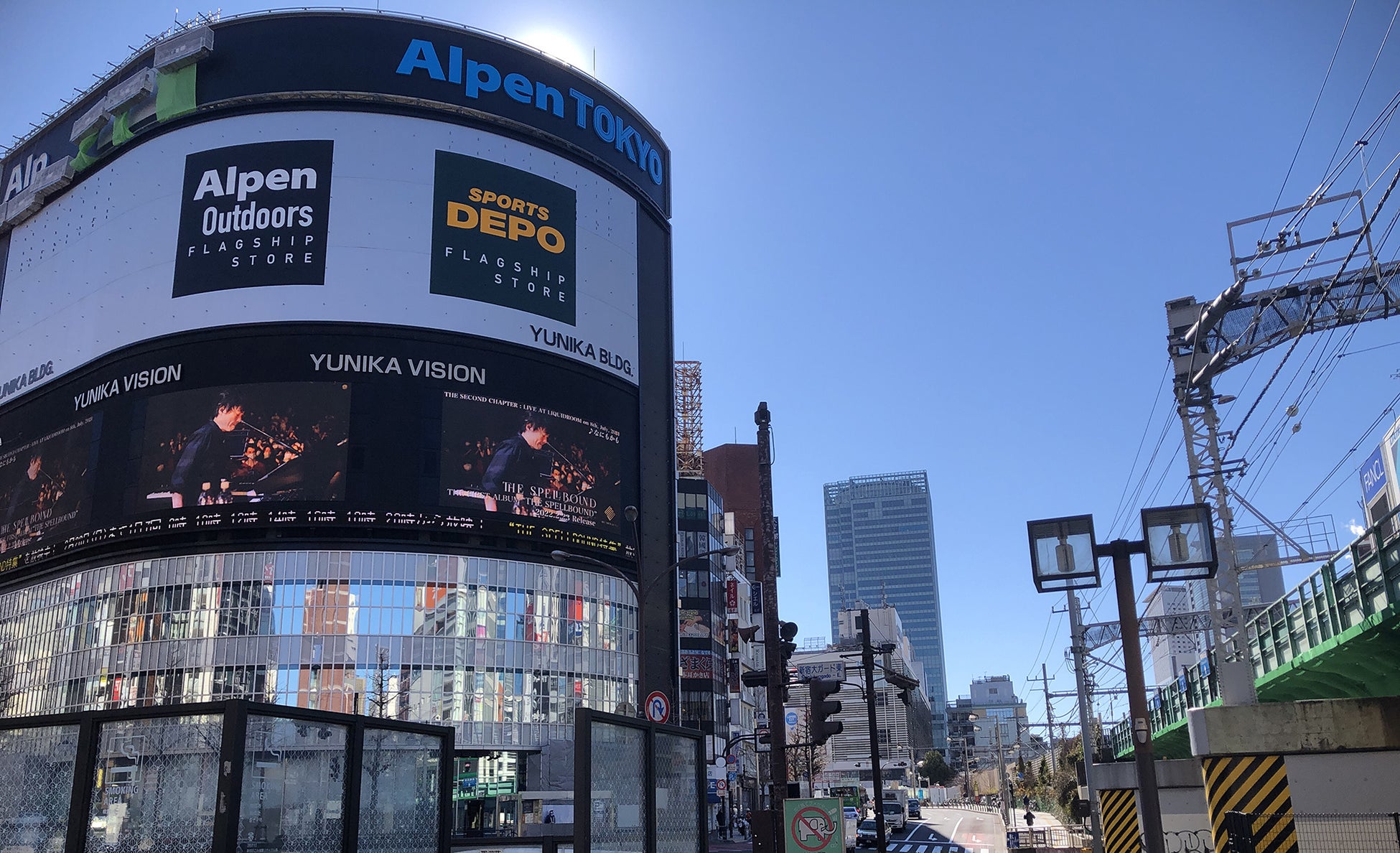新宿ユニカビジョンは、1日平均約350万人の乗降客数を誇る「新宿駅」の東口周辺に立地し、画面サイズ100㎡×3面の大型LEDビジョンです。全長52mに及ぶ屋外デジタルサイネージ広告で、山手線などJR車内からもご覧いただけます。3面それぞれに8台の指向性の高いスピーカーで広範囲にハイファイサウンドを実現しています。