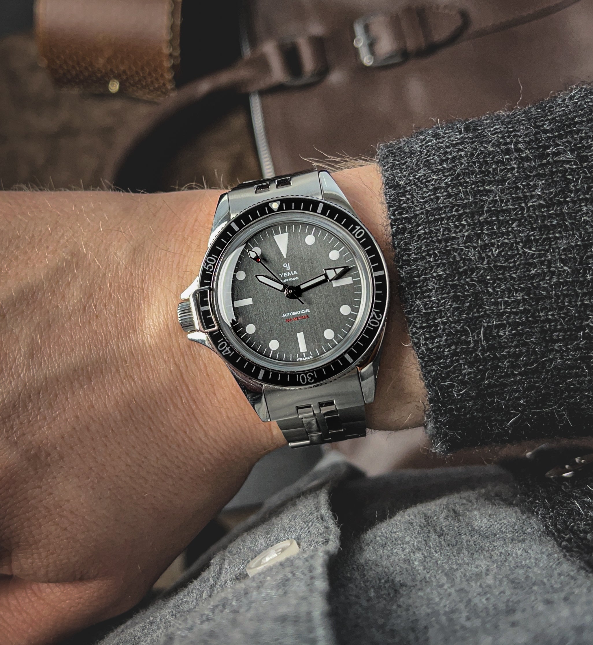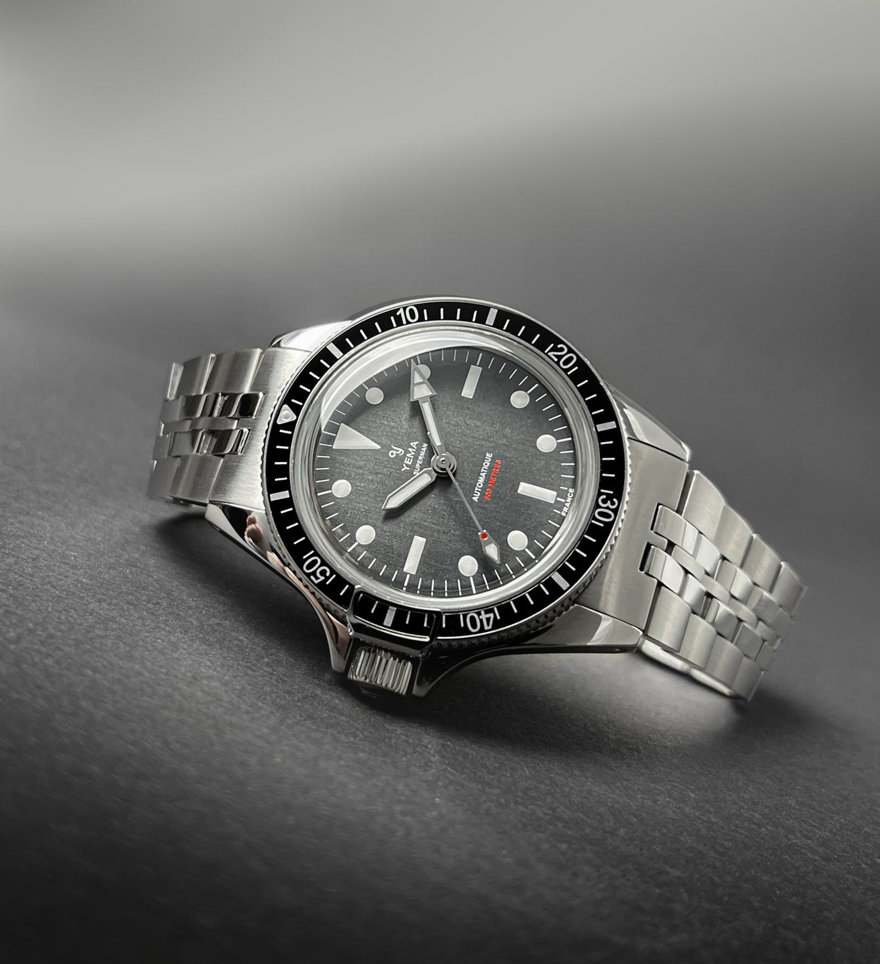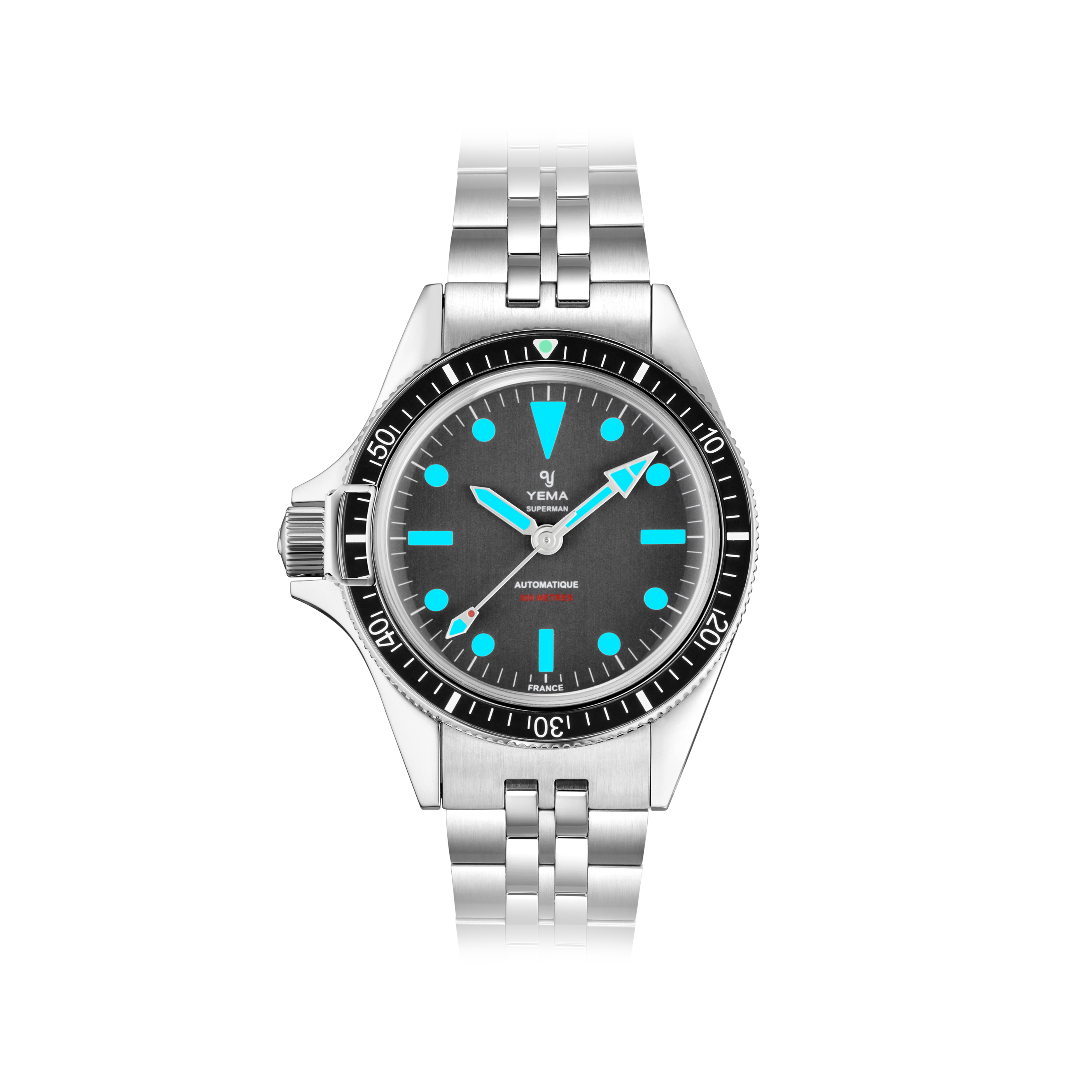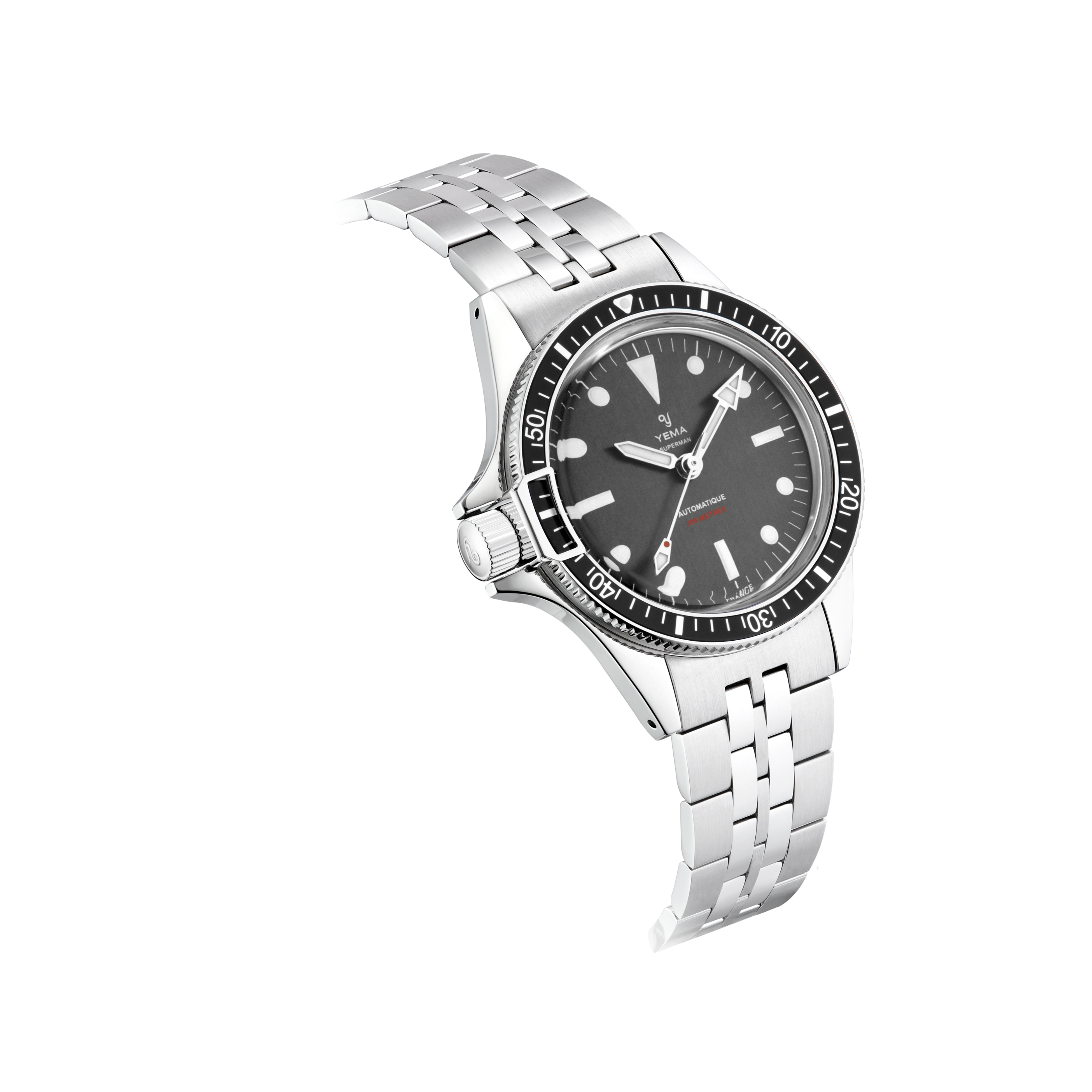 イエマのスーパーマンシリーズは1960年代に発表された後、現在も受け継がれるイエマのアイコンモデルです。新しいスーパーマン500 DESTROの注目すべき点は左利きの方や、お好みで右手首にも装着出来るようにデザインされた事です。自社製キャリバーYEMA2000を搭載し、初の防水性500mを達成。モダンデザインと技術革新により生み出された進化版スーパーマンは、フランスの時計業界において究極のプロフェッショナル ダイバーズウオッチとしての地位を確立いたしました。