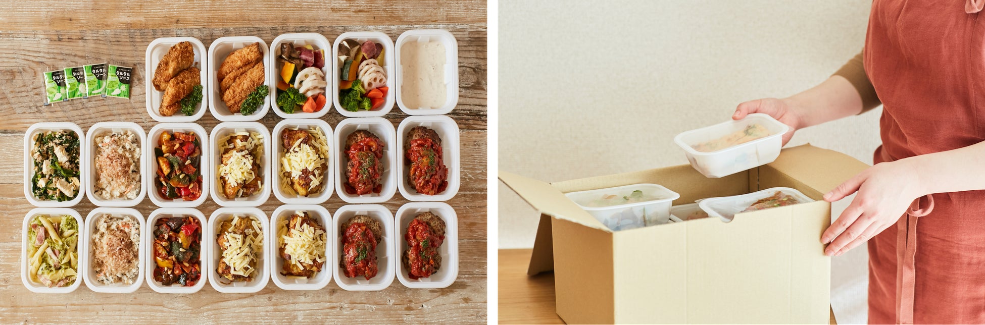 調理経験豊富なシェフと管理栄養士が監修し、専用キッチンで手作りしたお惣菜を、毎週ご家庭に冷蔵でお届けする宅食サービスです。1食あたり700円台(5食プランの場合749円)で炊事に関わる家事をお任せいただけます。現在1,000レシピ以上の料理を週替わりで提供しています。