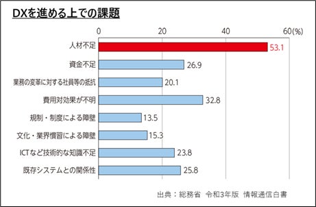 しかし、そのボトルネックが人材の不足という事態になっている声は多く聞かれます。総務省の「令和3年版 情報通信白書」によると、日本企業におけるDXを進める上での課題は「人材不足」が53.1%で最多という調査結果にもあるように、事業成長に本当に必要なスキルを持つ人材が今の日本では不足しているのが実情であり、実際のビジネス現場とのスキルギャップを埋めるリスキリングは経営の最重要課題といっても過言ではありません。