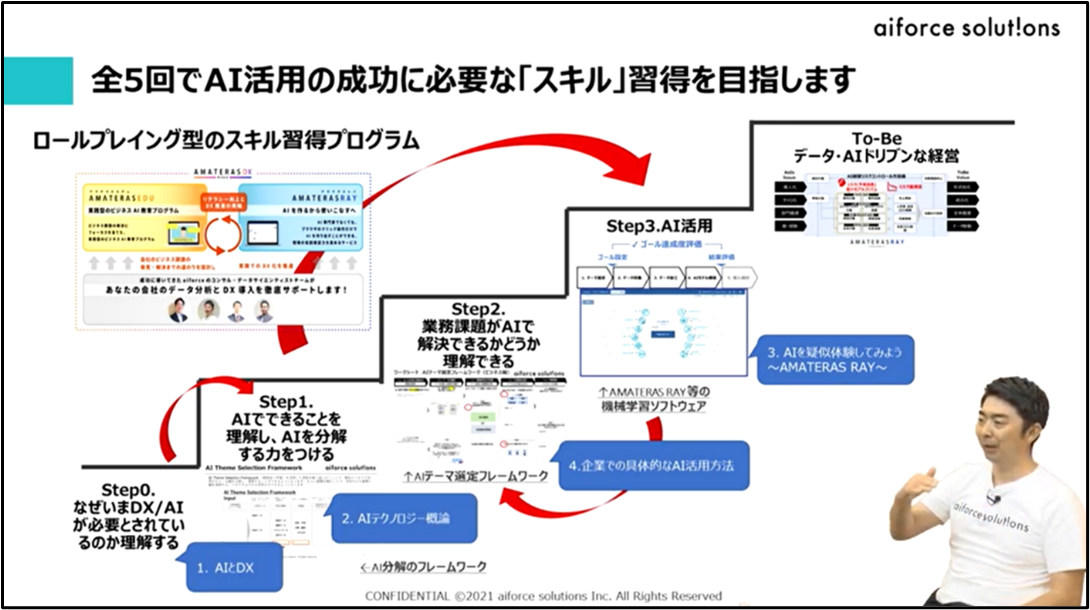 aiforceでは、この経営課題を一気に解決するAI活用プログラムを既に多くの大手企業に提供しており、その実績・事例をもとに更なる最適化が進んだ経験・知見があるため、まだDXやAI活用に取り組めていない日本企業の課題解決を図ることを目的として、講座を提供いたします。