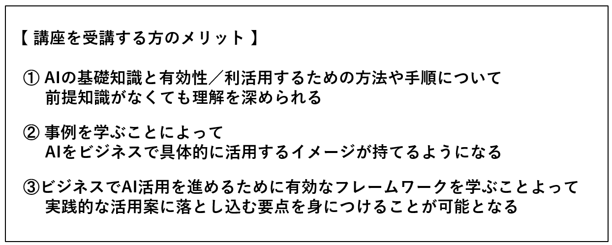 当講座を受講することで、「ぼんやりとしたAIのイメージ」から脱却し、これからの時代に必須となる「ビジネスでAIを活用するスキル」を身につけることができます。講座内では、短時間で効果の高い学びと成果を得られるように、下記の3点を軸とした詳細な解説をしております。