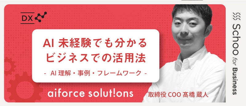 AI未経験の社員でもビジネスでAIを活用できるサービスを提供する株式会社aiforce solutions (本社:東京都千代田区、代表取締役社長:西川 智章、以下「aiforce」)は、インターネットでの学びや教育を起点とした社会変革を行う株式会社Schoo(本社:東京都渋谷区、代表取締役社長:森 健志郎、以下「スクー」)が提供する法人向けオンライン研修プラン『Schoo for Business』にて、企業のDX推進を一貫してサポートする講座として、aiforceのCOO髙橋蔵人による講座(全5回シリーズ)を提供することをご報告いたします。