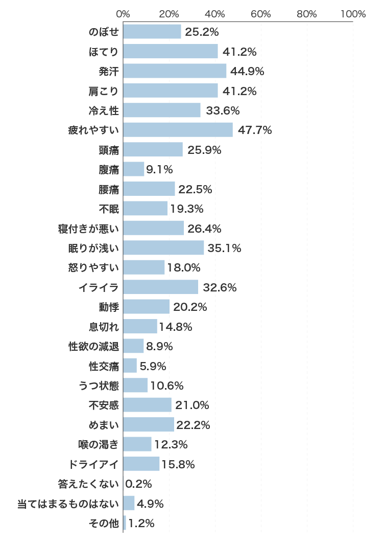 更年期症状は多岐に渡り、疲れ、発汗、ほてり、肩こりは4割超え