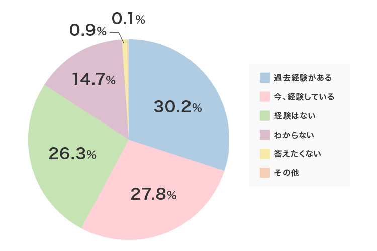 ※年代別で見ると経験中の割合は50代前半がピークで、60代以上になると経験済みの方が半分をこえています。