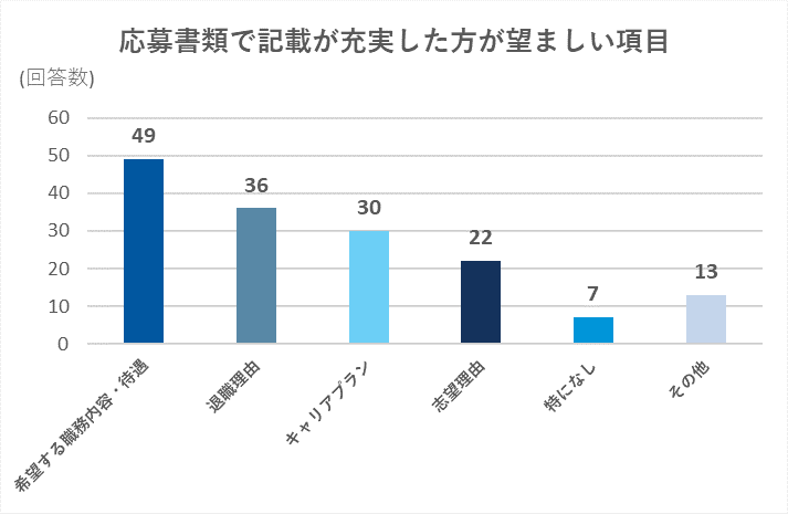 記載を充実させてほしい項目としては、「希望する職務内容・待遇」が最も多い結果となりました。理由として挙げられることが多かったのは「自社が希望を叶えられる環境か判断するため」です。「志望理由」が4位にランクしていることからも、書類選考の段階で具体的な自社への志望理由まで求める企業は少ないのかもしれません。