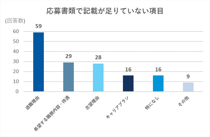 応募書類上で記載が足りていない項目としては、「退職理由」が最も多い結果となりました。「退職理由」はネガティブな内容になってしまうことも多いことから、記載が避けられていると考えられます。
