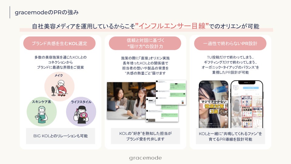 本プランでは、EMMEが持つインフルエンサーとのネットワークを活かし、「誰に」「どのように届けるか」を設計段階から最適化。gracemodeは“美容インフルエンサー向けの最適な届け方”を支援する存在としてサービス提供します。