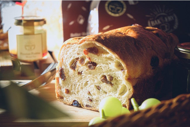 ふっくら果肉のレーズンの豊かな甘みと、生食パンのもちもちふわふわな食感がなじんで、一口食べた瞬間に誰もが笑顔になるレーズン食パン。