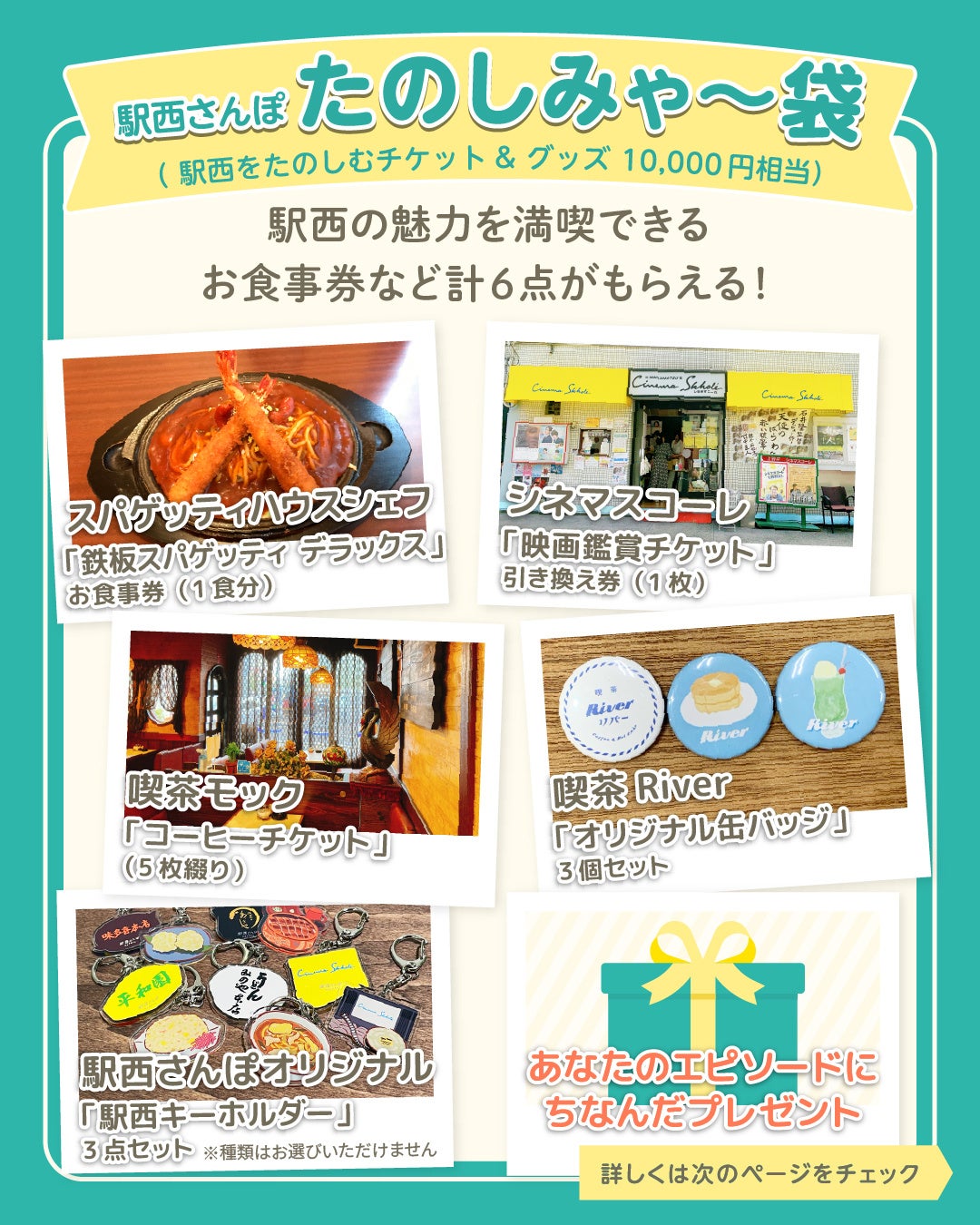 内容は、駅西店舗で使えるお食事券や映画鑑賞券など、“駅西をたのしむ”ための6点セットを用意。