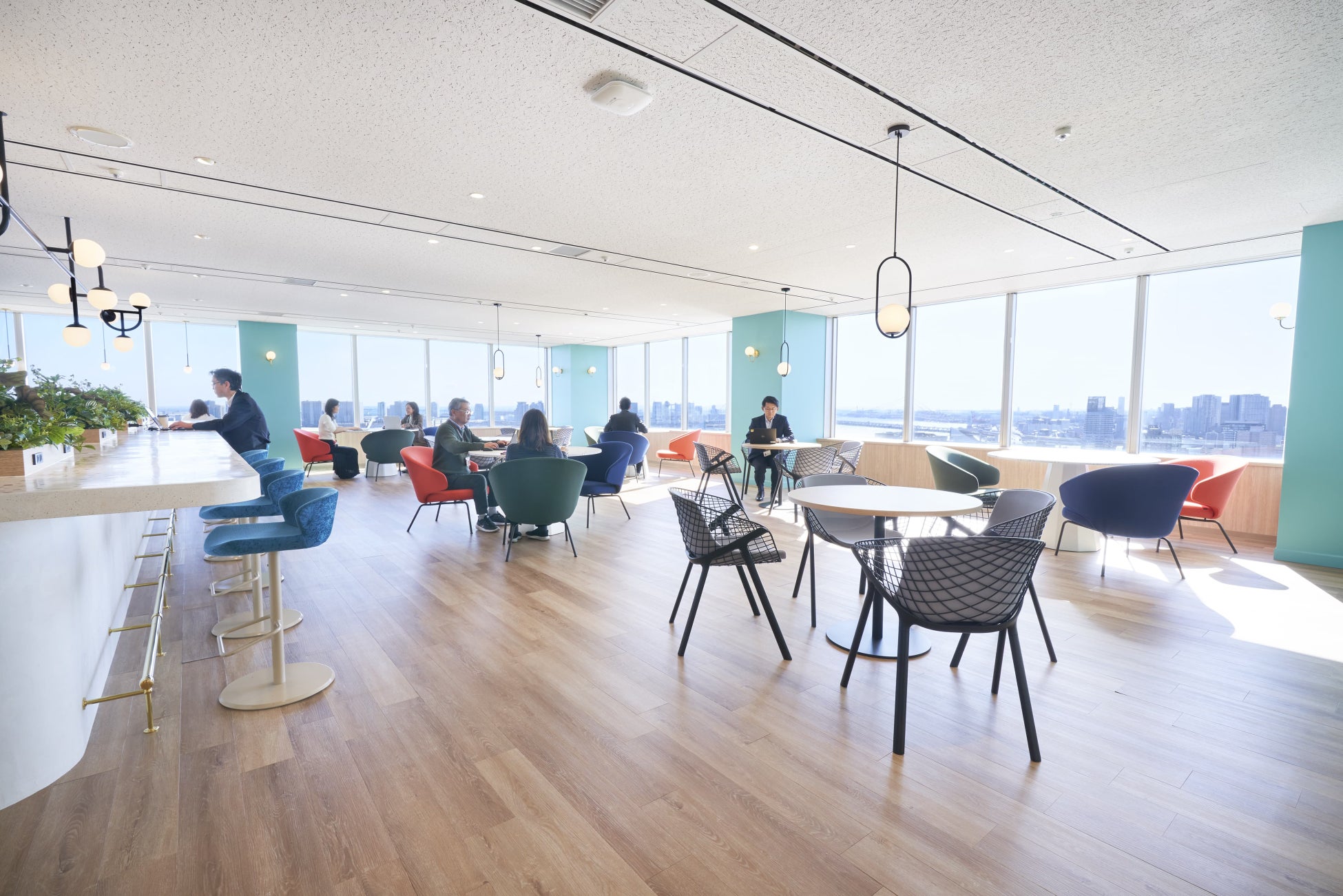 High Communityには社員やお客様が利用できるカフェスペースがあります。お客様との打ち合わせはもちろん、社員も利用しやすい内装にリニューアルしました。カフェドリンクの香りやデザイン性に優れた家具、オフィスから見える東京湾の景色など、心身をリフレッシュさせる仕組みが、上司や仲間とのオープンな会話やお互いの理解を深めやすくし、社員エンゲージメントの向上につながります。