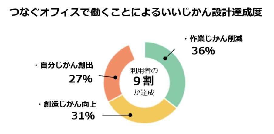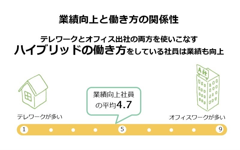 2021年7月には、上記7つの「High」エリアのうち、「High Focus」、「High Collaboration」、「High Creativity」、「High Function」、「High Secure」を先行してオープンしました。オープン半年後に行ったアンケート調査※から、ハイブリッドな働き方を実施した社員には業績向上を実現している割合が多いことや、その日の業務目的に応じてつなぐオフィスの各エリアを利用することで「いいじかん設計」の考え方に沿った働き方を実現した社員が9割以上いることが分かりました。