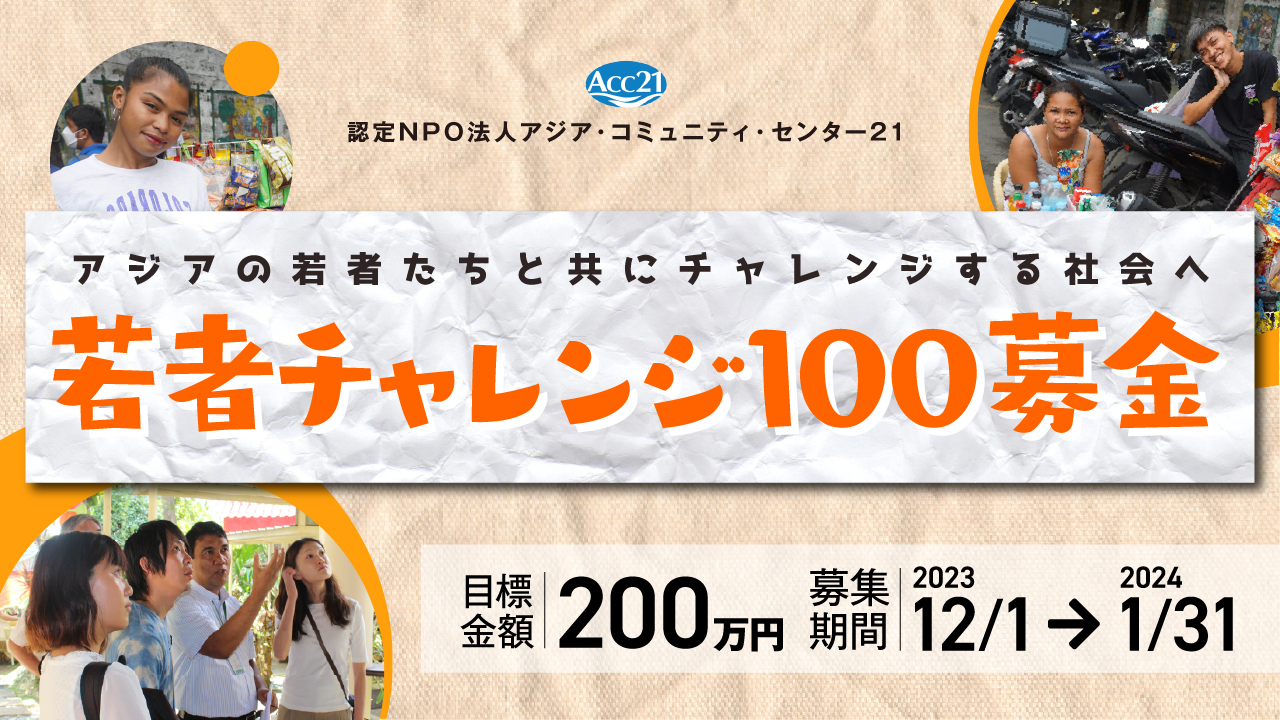 そのスタートにあたり、2024年の活動のために200万円を目標として、「若者チャレンジ100募金―アジアの若者たちと共にチャレンジする社会へ―」と題し、多くの方々からのご寄付を募ります。