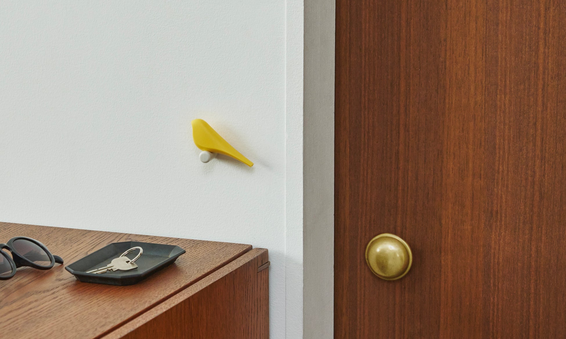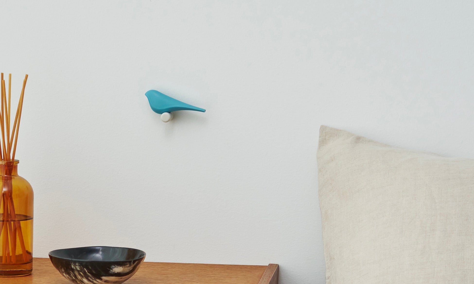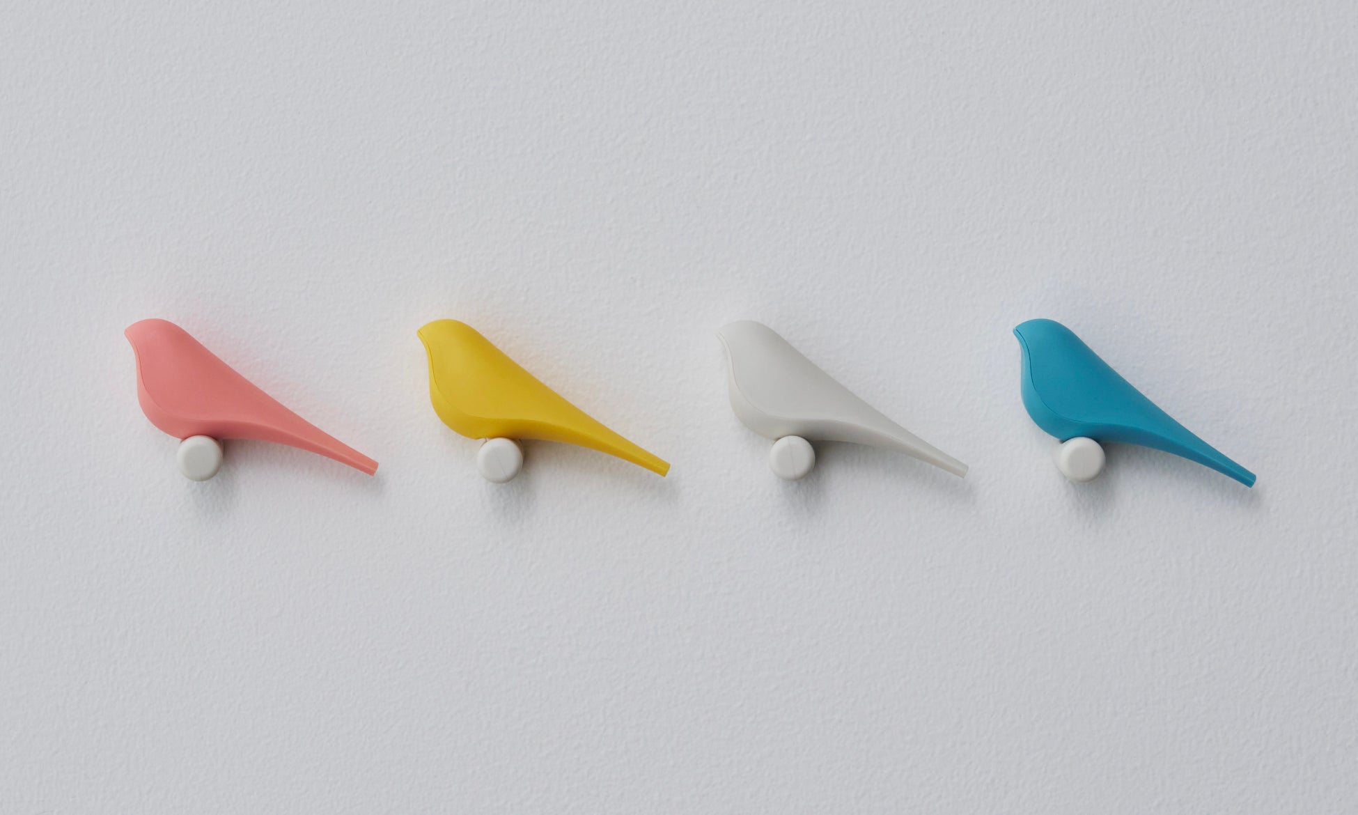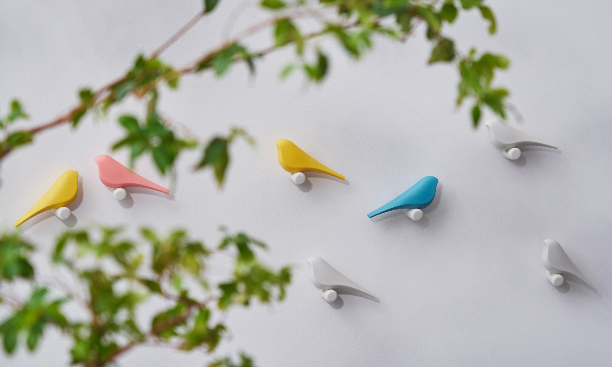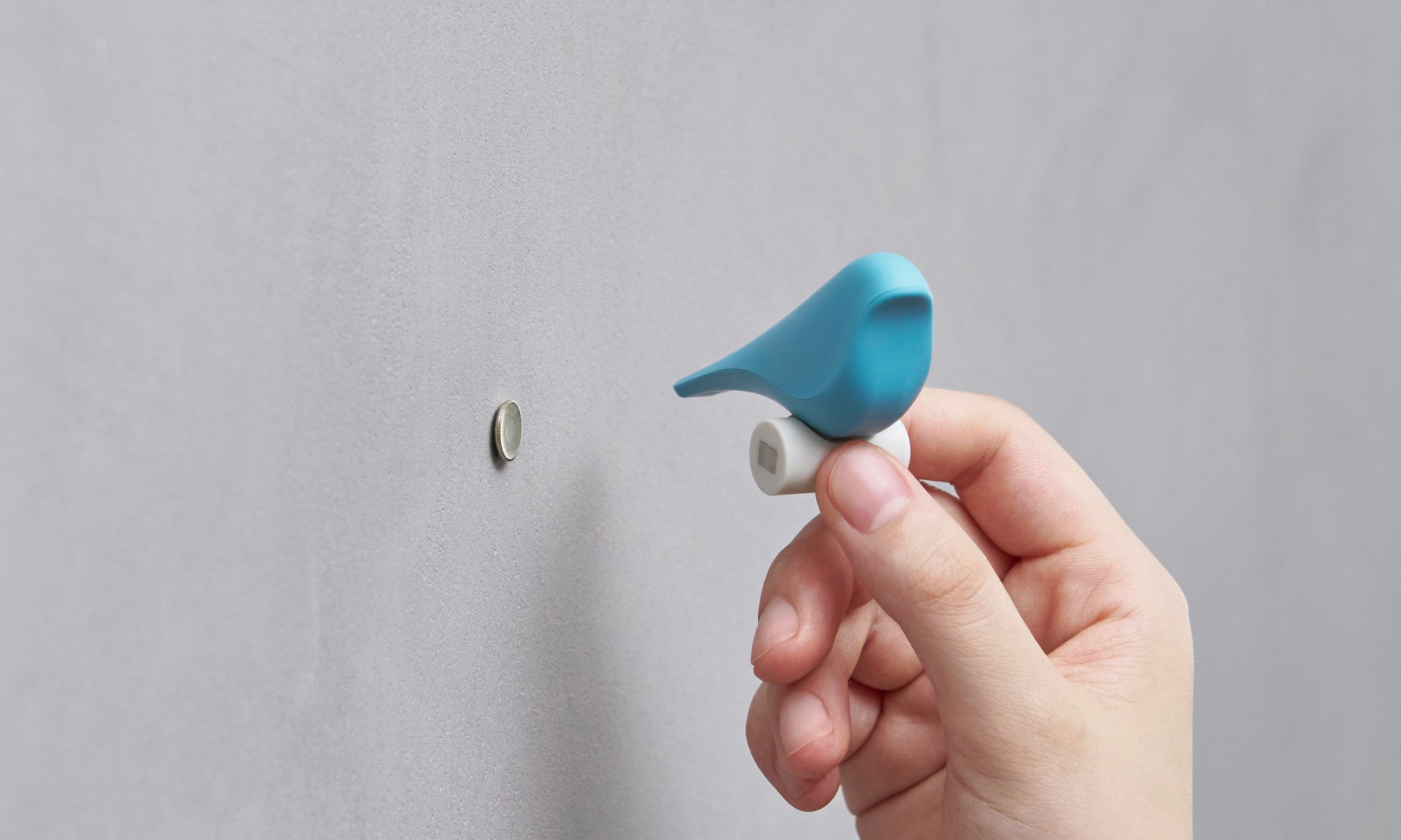 止まり木に付いたマグネットで、玄関やキッチン、シェルフの柱などに自由に設置でき、小さなカナリアがインテリアに彩りを添えます。