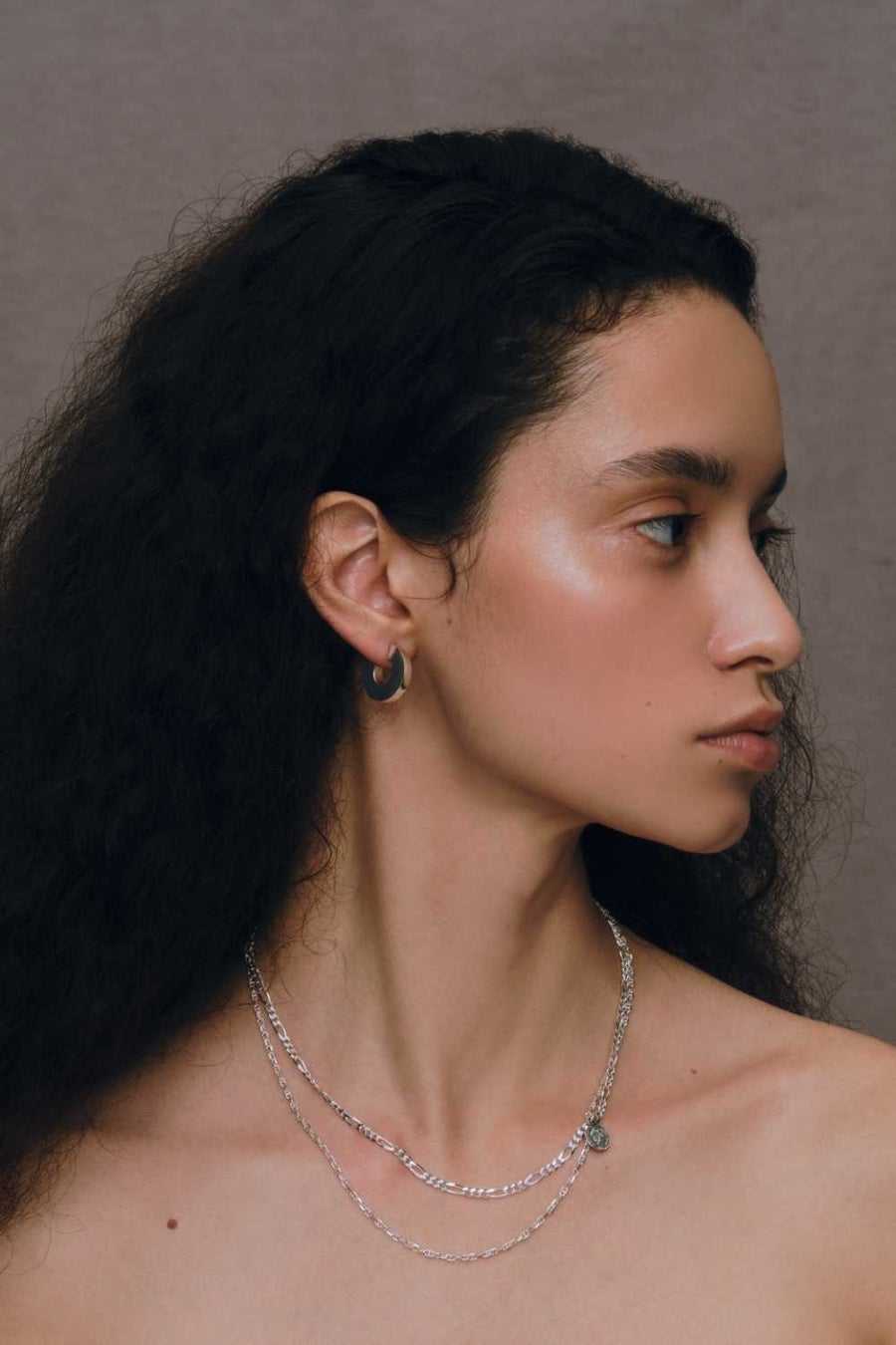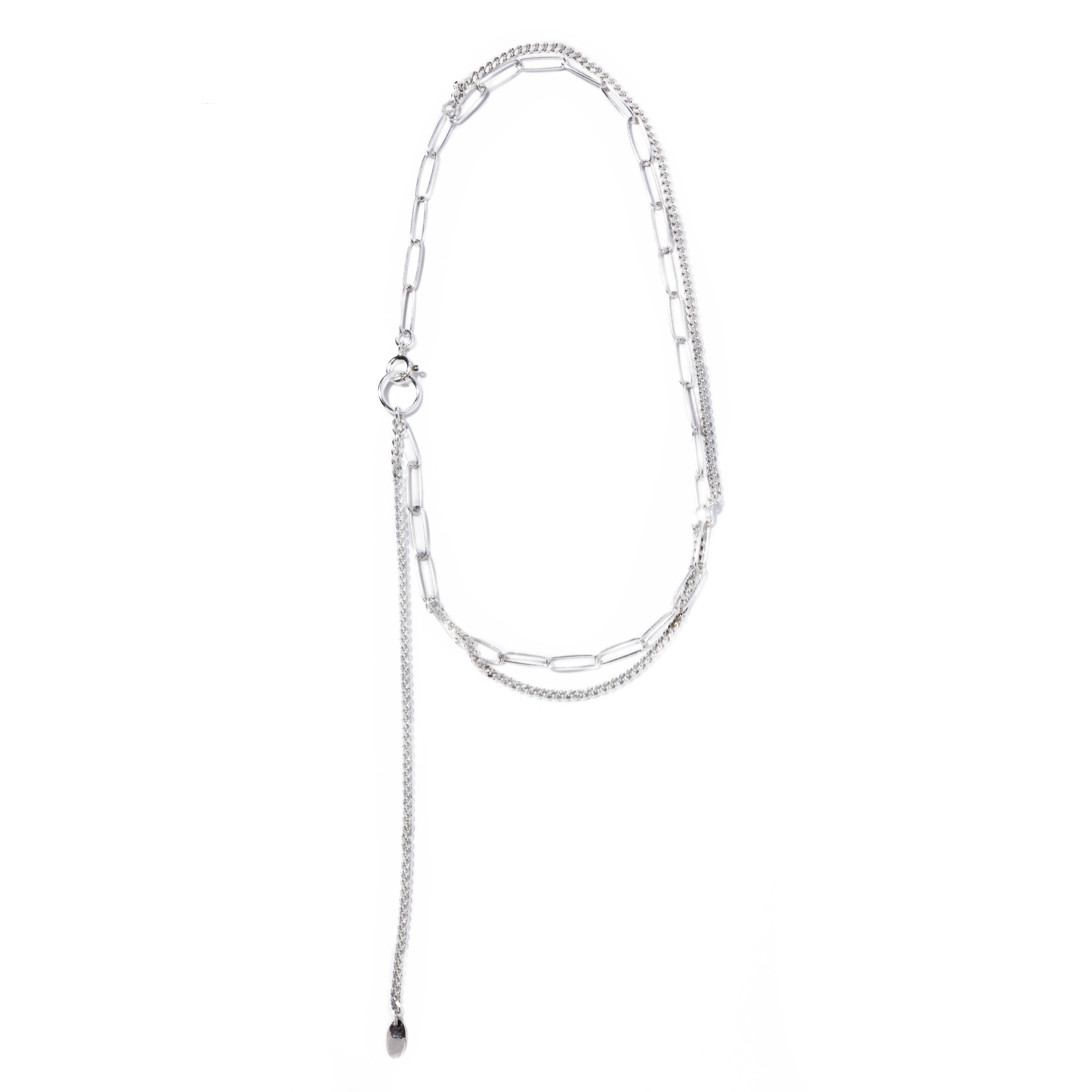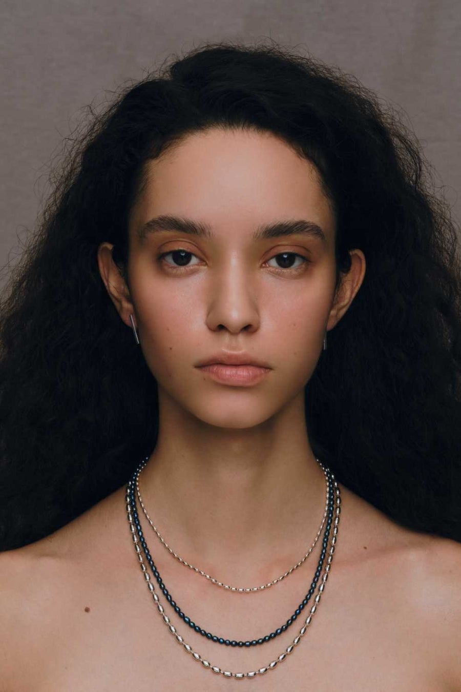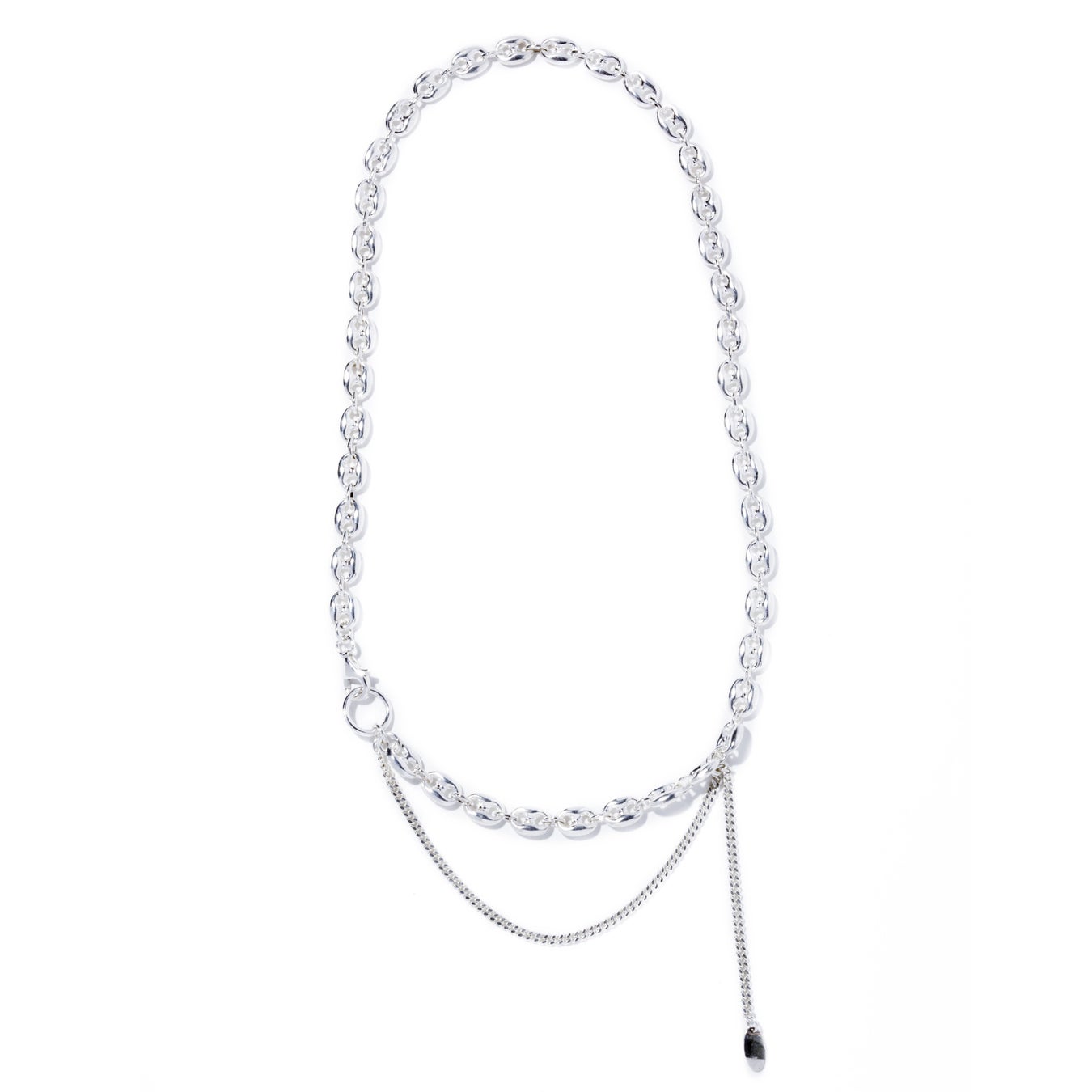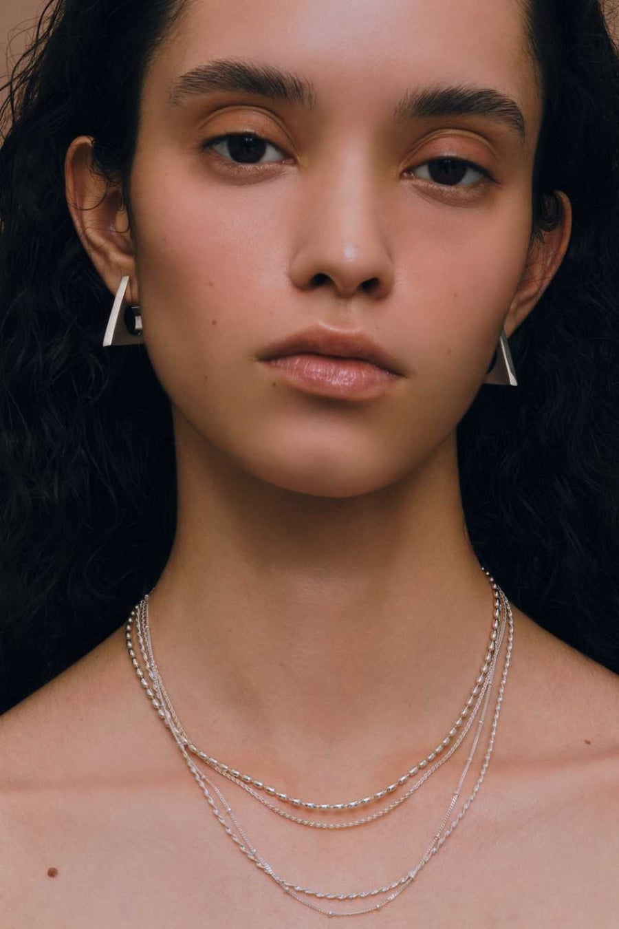 異なるチェーンが生み出すコントラストを強調するシンプルな装いに合わせて。