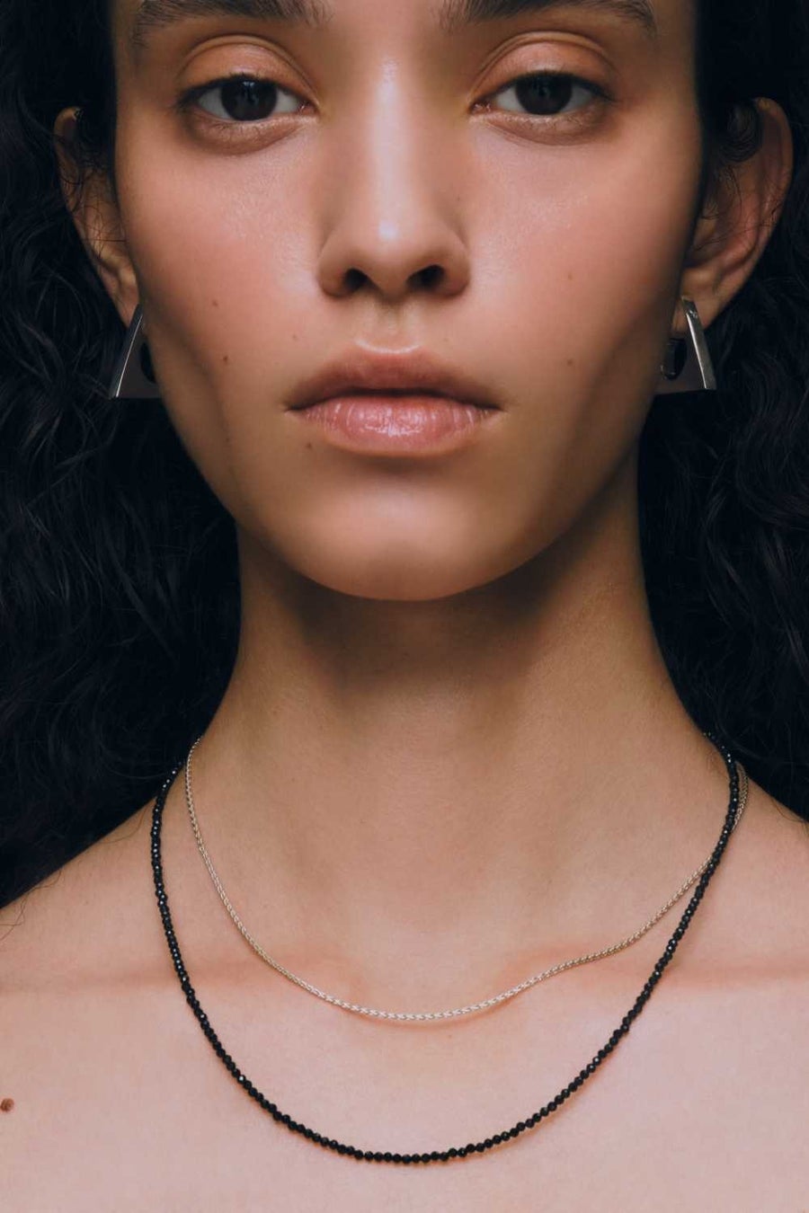ブラックの輝きがモダンなカットのブラックスピネルを連ねたネックレス。
