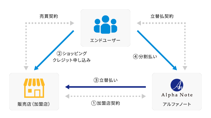 ショッピングクレジットは、ユーザーが店舗で買い物をした際、その代金をアルファノートが立替払いを行うサービスです。クレジットカードを持たないユーザーでも利用することができ、希望の分割回数で返済を行うことが可能です。