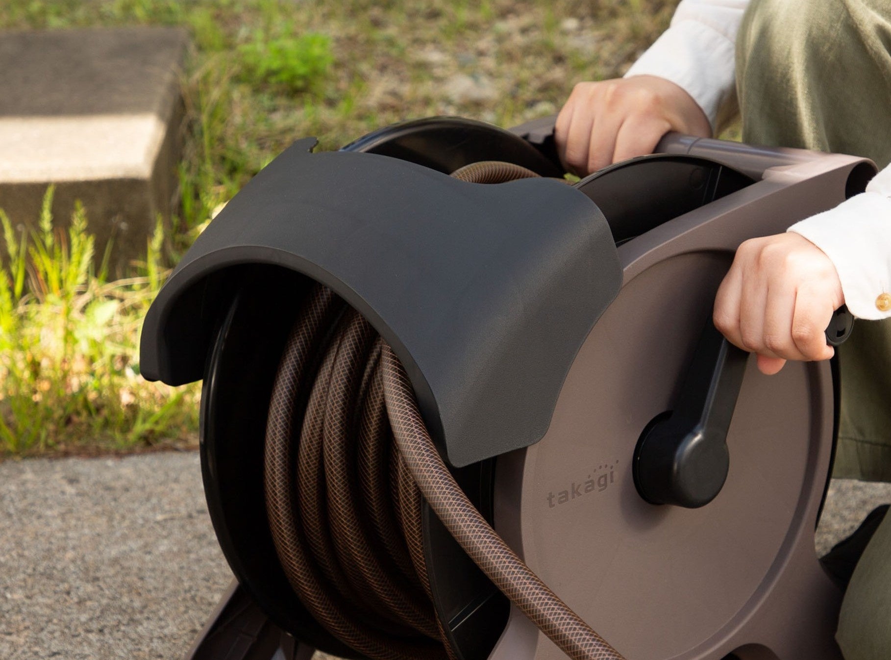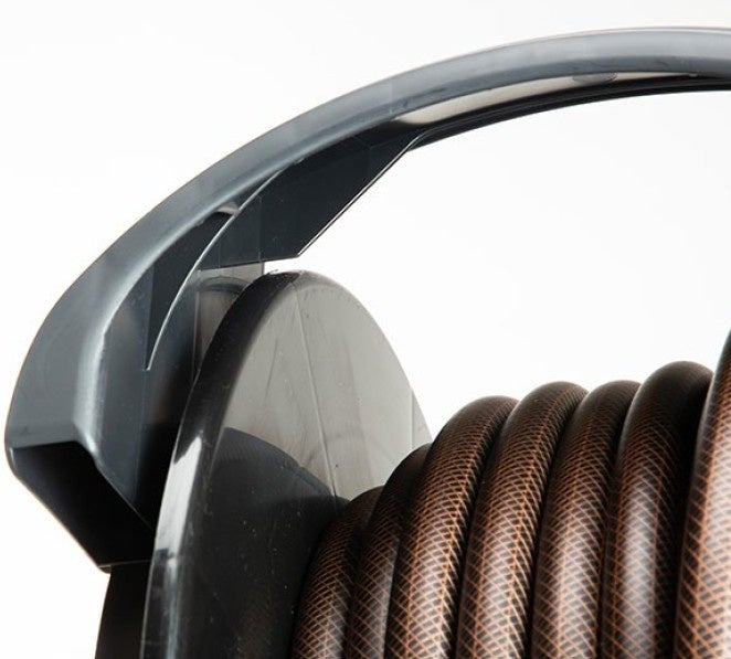 「オーロラBASE PLUS」は、アーチ状のガイドカバーを設けることでホースが片側に寄ることを防止し、巻き取りをさらに楽に行っていただけます。