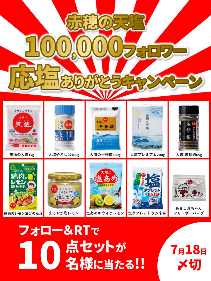 赤穂の天塩公式Twitterアカウント10万フォロワー突破! 『赤穂の天塩100,000フォロワー応塩(おうえん)ありがとうキャンペーン』