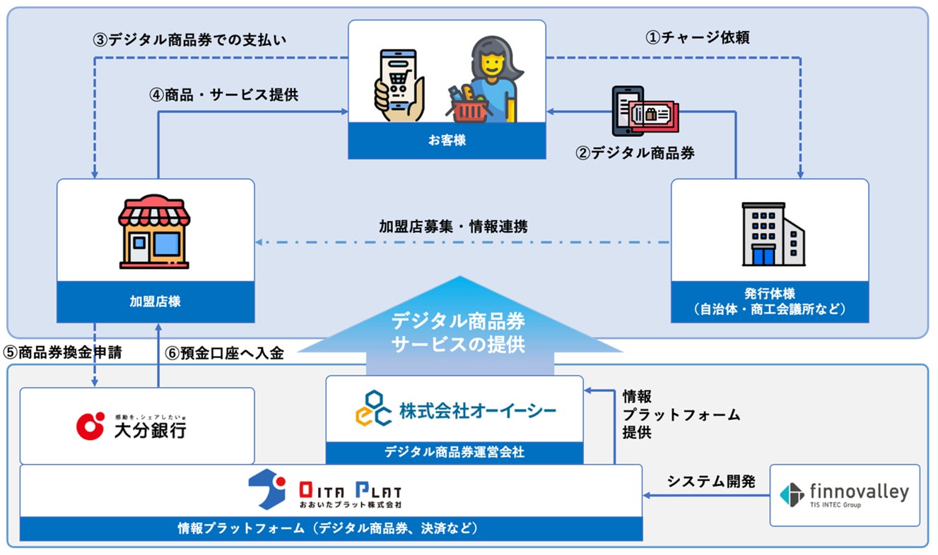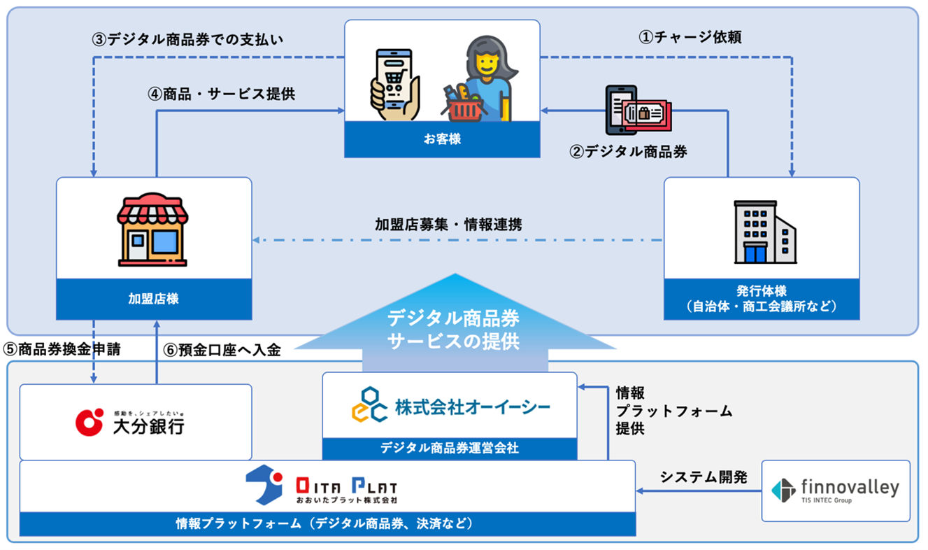 株式会社オーイーシー(代表取締役社長 加藤 健)は、おおいたプラット株式会社(代表取締役社長 上野 秀寿)と株式会社フィノバレー(代表取締役社長 川田 修平)の電子地域通貨プラットフォームを活用した、「デジタル商品券 発行スキーム」が、2026年6月1日から利用開始される「大分市プレミアム付き商品券事業」(実施主体:大分商工会議所)に採択されたことをお知らせします。
