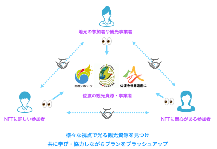 コンテスト参加者は、佐渡・新潟に止まらず全国の学生・若者から募集します。様々な目線で佐渡の魅力を共に探し、活かし方を考え、プランを磨き上げていく。佐渡のことも、NFTのことも、共に学びながら、出会った仲間とプランを作っていく。そんな「コミュニティ型コンテスト」形式で開催します。