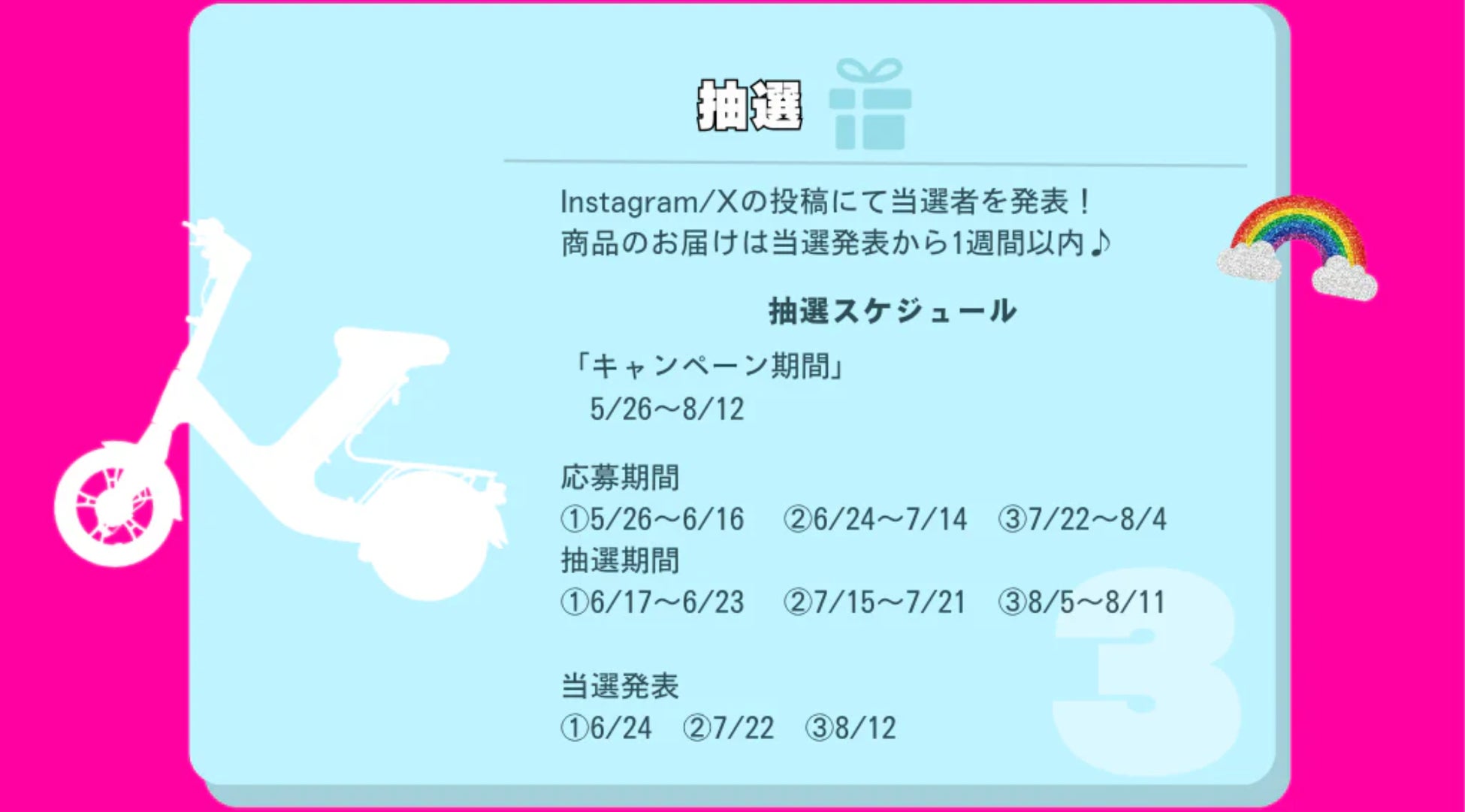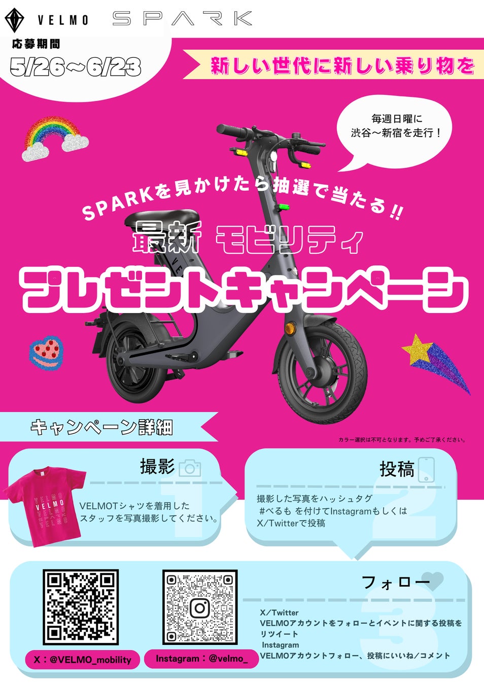 100人のインフルエンサーやドラァグクイーンがピンクにデコレーションされた次世代型モビリティ「SPARK」に乗り、渋谷・新宿をサイクリングする様子をSNSにて投稿いたします。SNSをご覧いただいた皆様にハッシュタグを付けて投稿いただくと抽選形式でSPARKを合計3名様にプレゼントさせていただくイベントとなります。