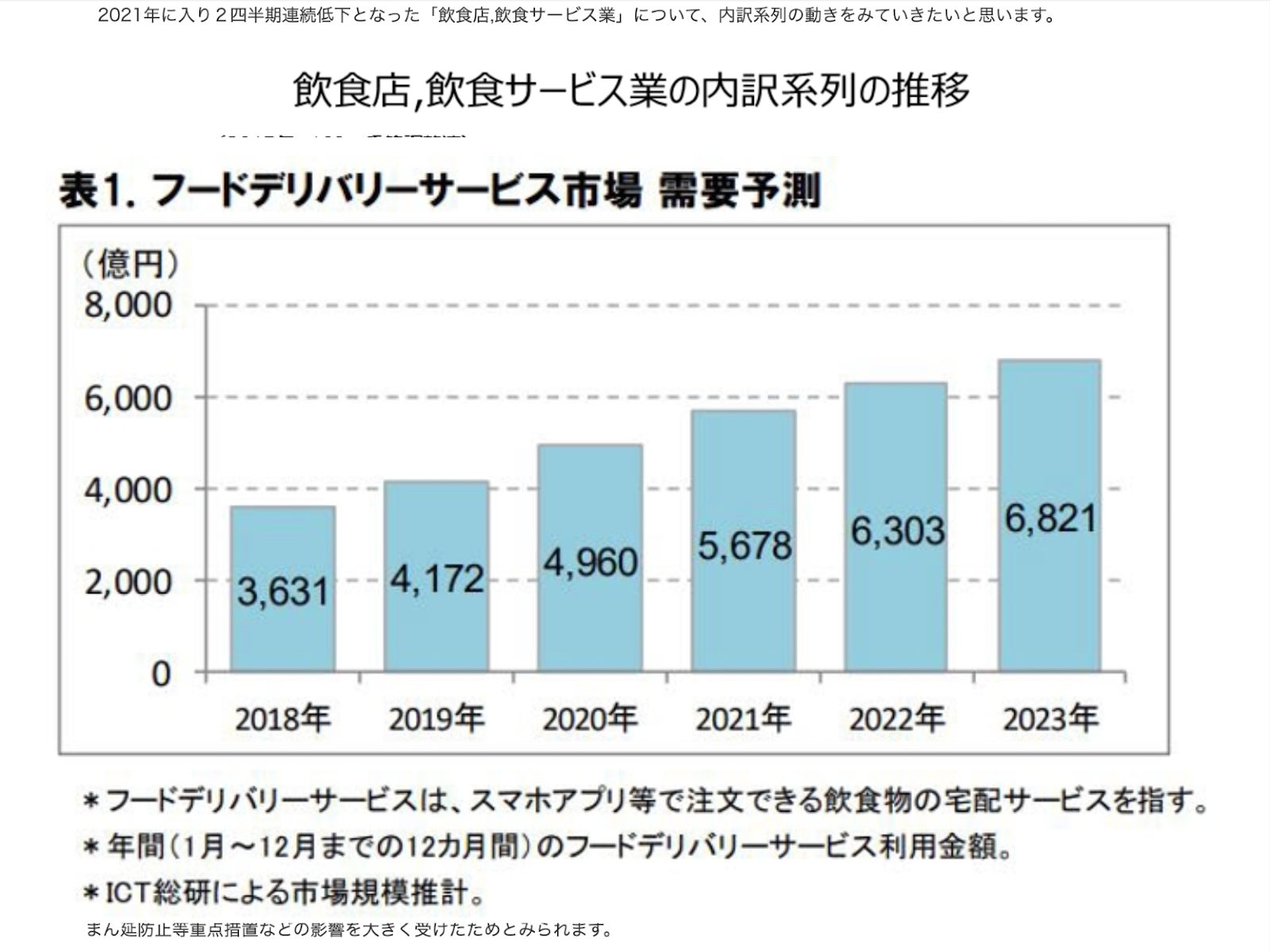 2015年から始まった中食産業の拡大もコロナ禍をきっかけに更に需要は高まり、コロナ禍が明けてからも、中食産業(テイクアウト、デリバリー)の需要は右肩上がりで伸びています。