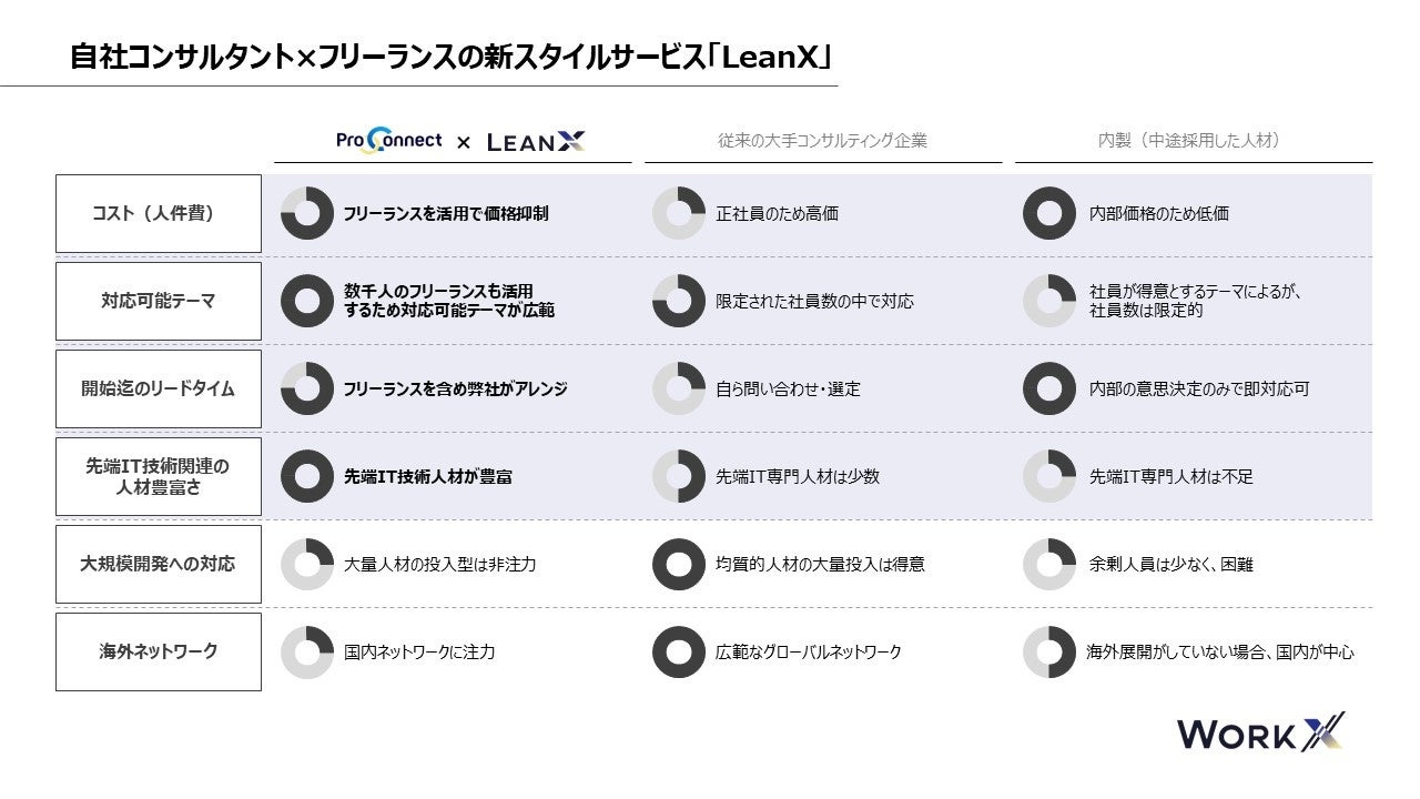 また、WorkX社員のコンサルタントによる徹底的な伴走支援とフリーランスの柔軟な調達を掛け合わせた新たなコンサルティングスタイル「LeanX(リーンエックス)」を展開し、様々な企業・領域での課題解決をサポートしてまいりました。