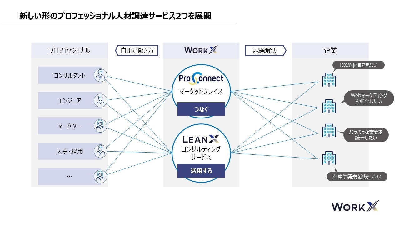 株式会社WorkX(東京都渋谷区、代表取締役:東野智晴、以下:WorkX)は、『次の100年の「働く」を作る。』をビジョンに掲げ、企業課題を解決するための新しい形のプロフェッショナル人材調達を実現する、2つのサービスを提供しています。