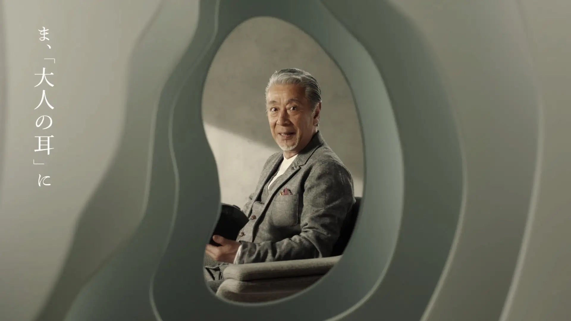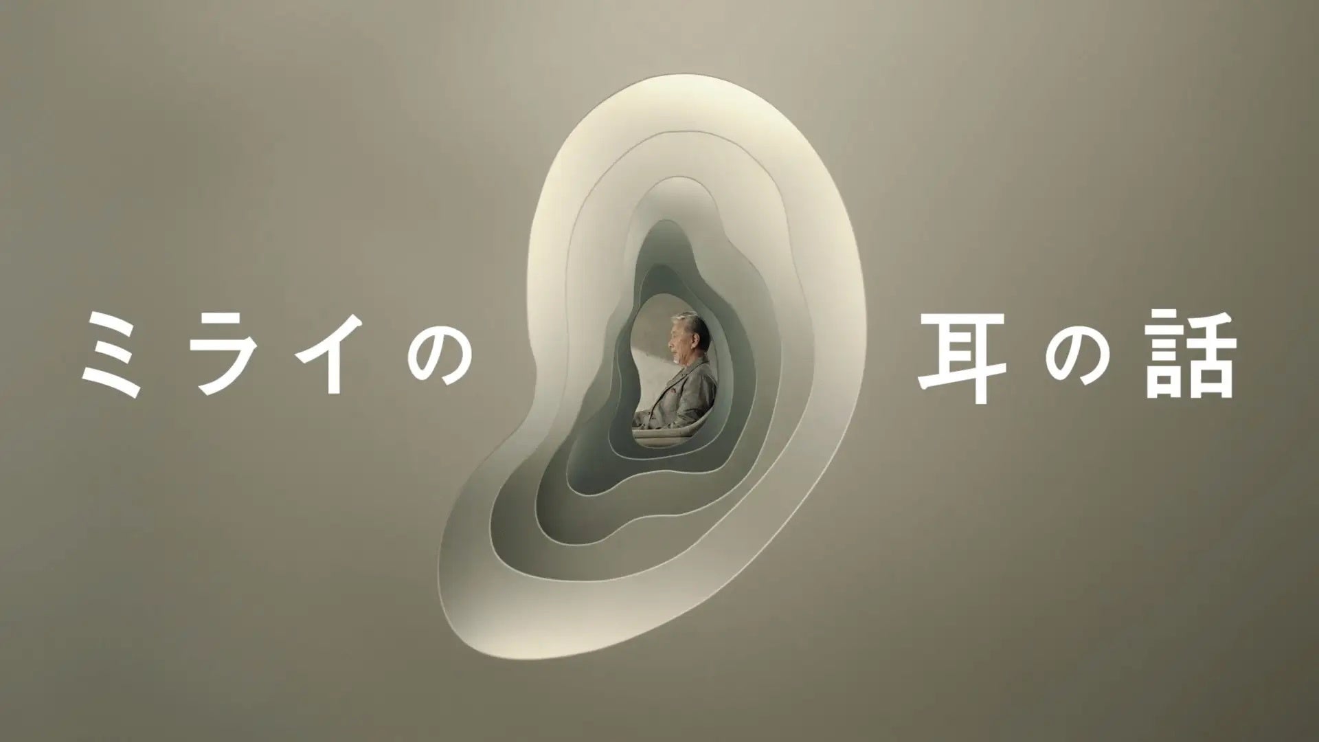 高田さんは、巨大な耳型のオブジェの奥で、「ミライスピーカー・ホーム」をまるでペットを愛でるかのように大切そうに抱えながら登場します。そして“ミライの耳の話”を語りかけながら、特許技術によって、テレビの音量を上げずに、部屋中に広がる音の様子と、くっきり聴こえていく音の様子を高田さんの表情とともに表現しています。
