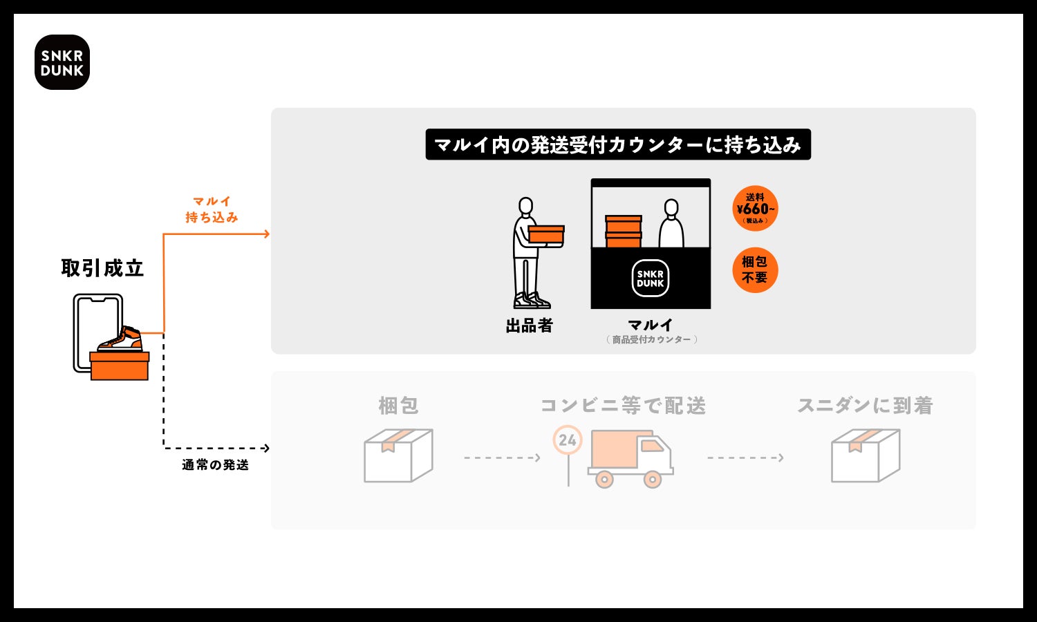 スニダンにて取引成立後に商品持ち込みが可能なSNKRDUNK(スニーカーダンク)原宿店・心斎橋店は、連日多くのお客様にご利用いただき、大変ご好評いただいております。この度、商品持ち込みをより多くのお客様にご利用いただけるよう、丸井グループの物流を担う株式会社ムービングの配送ネットワークを活用させていただき、マルイ(関東圏の一部店舗を対象)への商品持ち込みが可能となります。