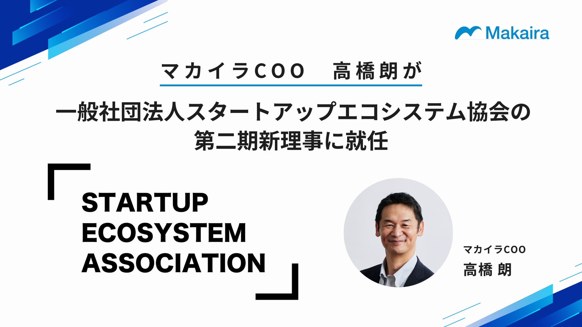 スタートアップが数多く産まれ、成長し、最終的には経済発展に貢献できるような環境・生態系(エコシステム)を実現することを目標として設立された一般社団法人スタートアップエコシステム協会( 所在地:東京都渋谷区 、略称: SEAJ)の第二期理事として、マカイラ株式会社(東京都千代田区、代表取締役CEO:藤井宏一郎、代表取締役COO:高橋朗、以下マカイラ)のCOO・高橋朗が就任したことをお知らせいたします。