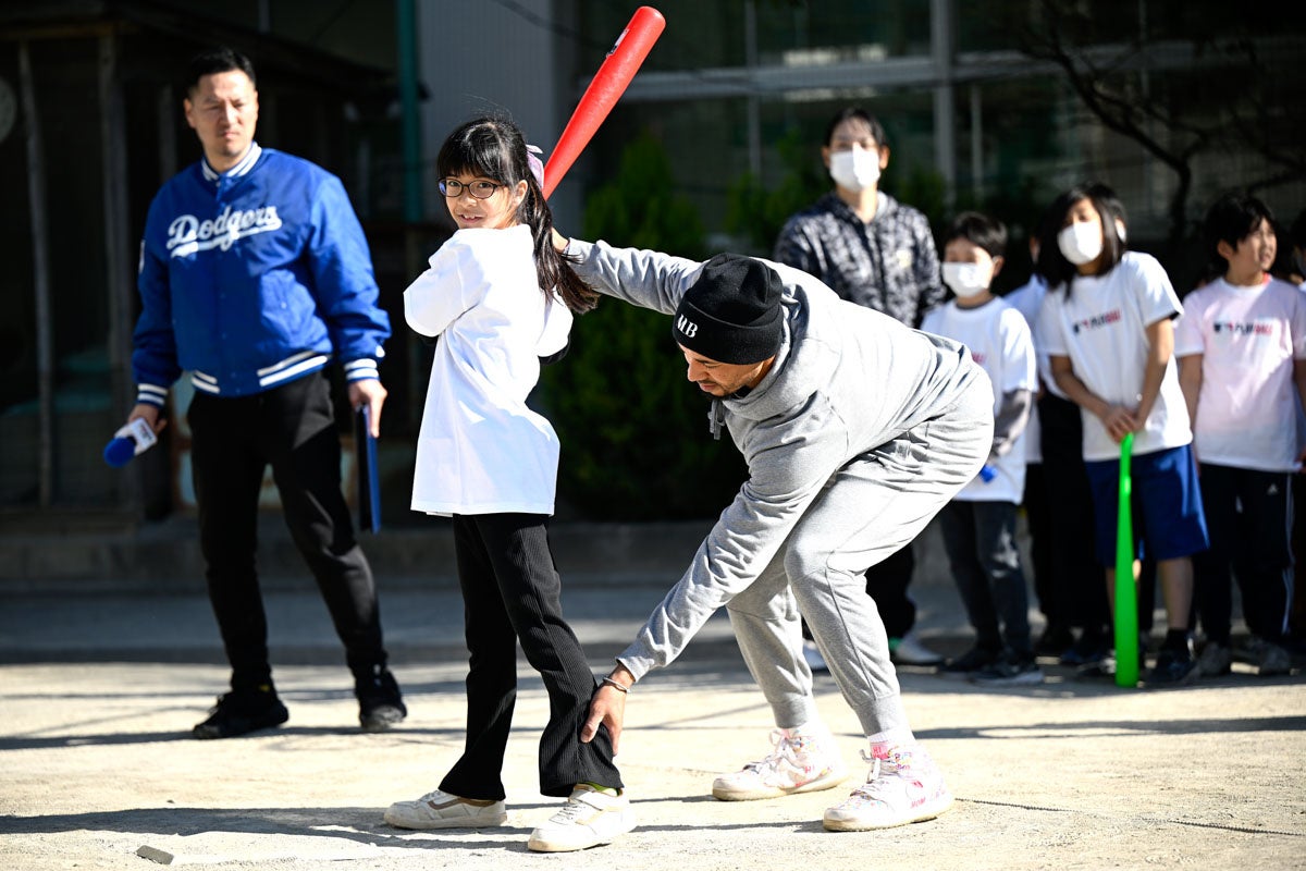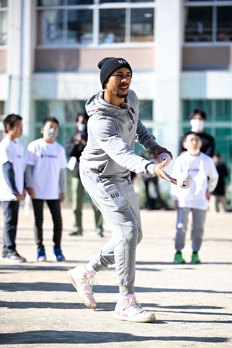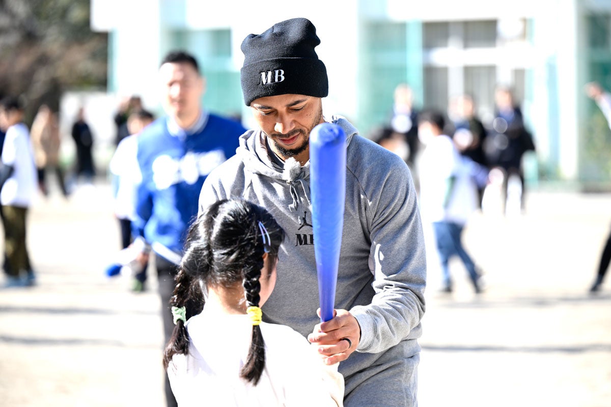 PLAY BALLは、野球経験の少ない子どもたちを対象にこれまでも全国各地で開催されてきましたが、今回は、昨シーズン、ワールドシリーズ制覇の立役者の一人として大きな活躍を見せ、2025年3月18、19日に東京ドームで開催されるシカゴ・カブスとロサンゼルス・ドジャースのシーズン開幕戦「MLB Tokyo Series presented by Guggenheim」への出場も期待されるベッツ選手がサプライズ登場しました。オフシーズンには、病院への慰問や自身が設立したチャリティ基金「5050 foundation」を通じた活動など、スタジアムの外でも多くの夢を与えているベッツ選手が突然日本の小学校に現れ、小学3~4年生の児童約60名と一緒に、ピッチング、バッティング、ボールキャッチなどを一緒に楽しみ、野球の楽しさを伝えました。