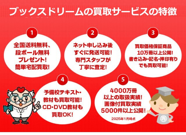 買取では、「学参プラザ(受験参考書・問題集・赤本・予備校テキスト・教材の専門買取店)」「専門書アカデミー(専門書・医学書・大学教科書・資格試験参考書・問題集・予備校テキスト・教材の専門買取店)」「メディカルマイスター(医学書・医療系書籍・予備校テキスト・教材の専門買取店)」の3サイトを展開しています。インターネットから申し込みをして宅配便の着払いで送るだけの簡単買取。全国から送料無料で買取可能。ご希望の方には段ボール無料送付サービスも行っています。
